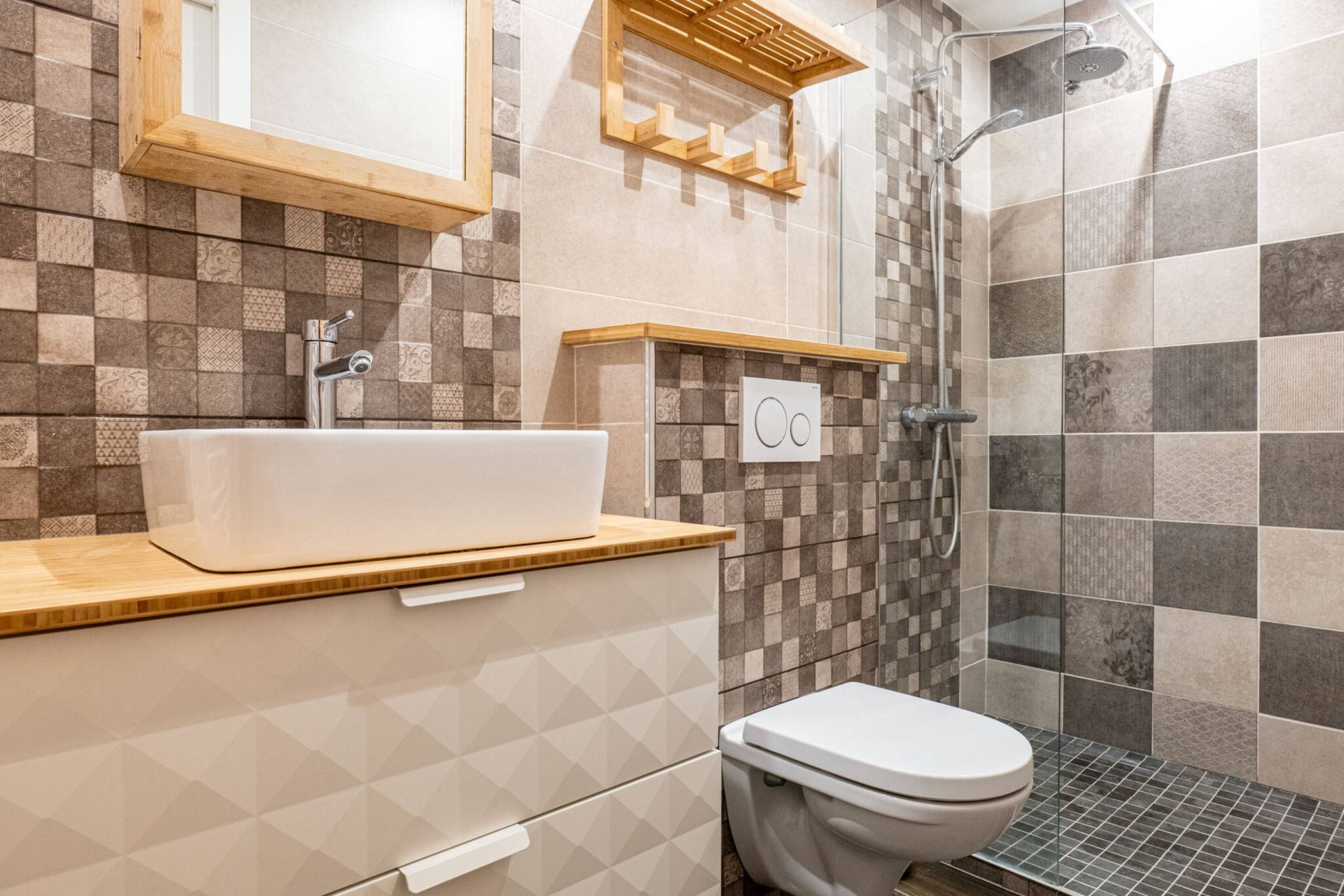 🚿 La salle de bain moderne offre une douche à l’italienne et un meuble vasque fonctionnel.