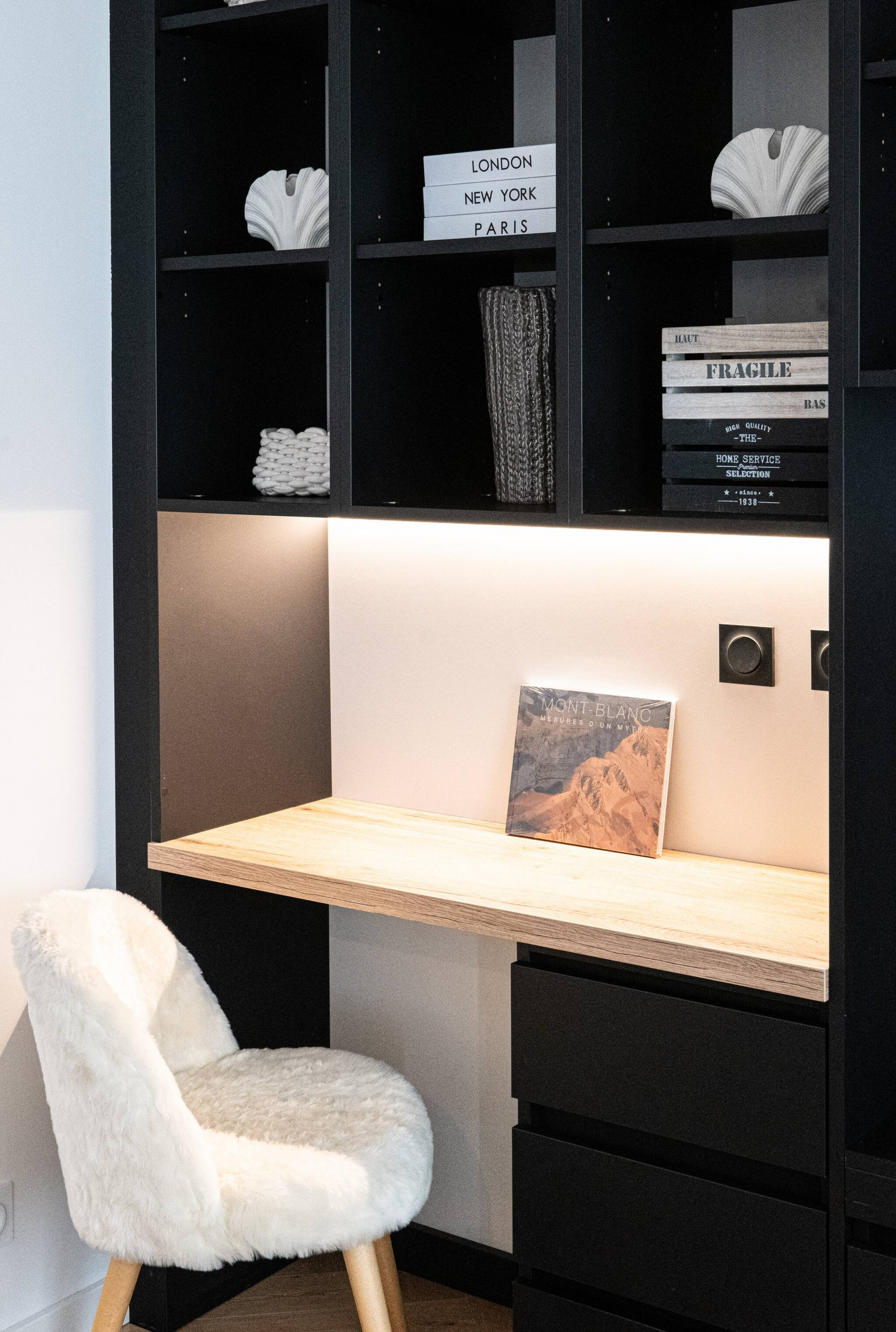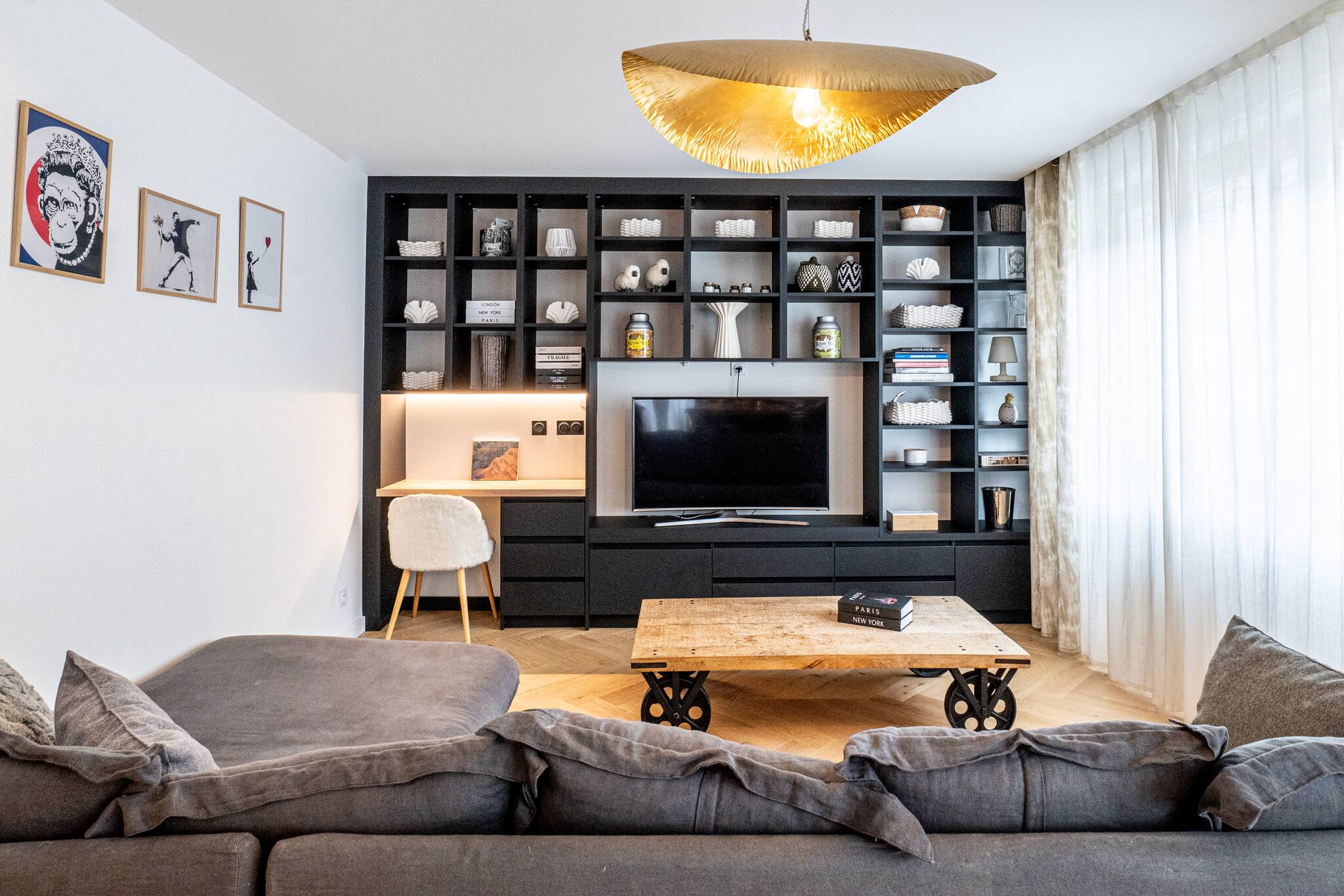 🛋️ Salon spacieux et lumineux, avec télévision, grande bibliothèque, confortable Canapé d'angle et un espace bureau pour vos moments de travail ou de détente.