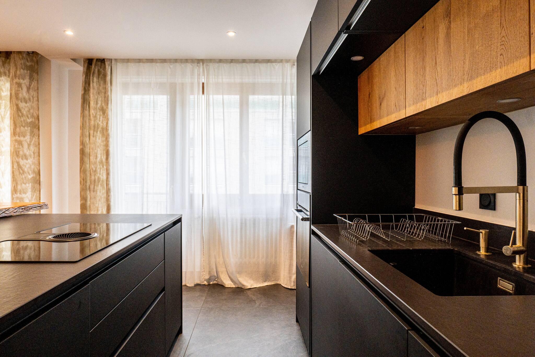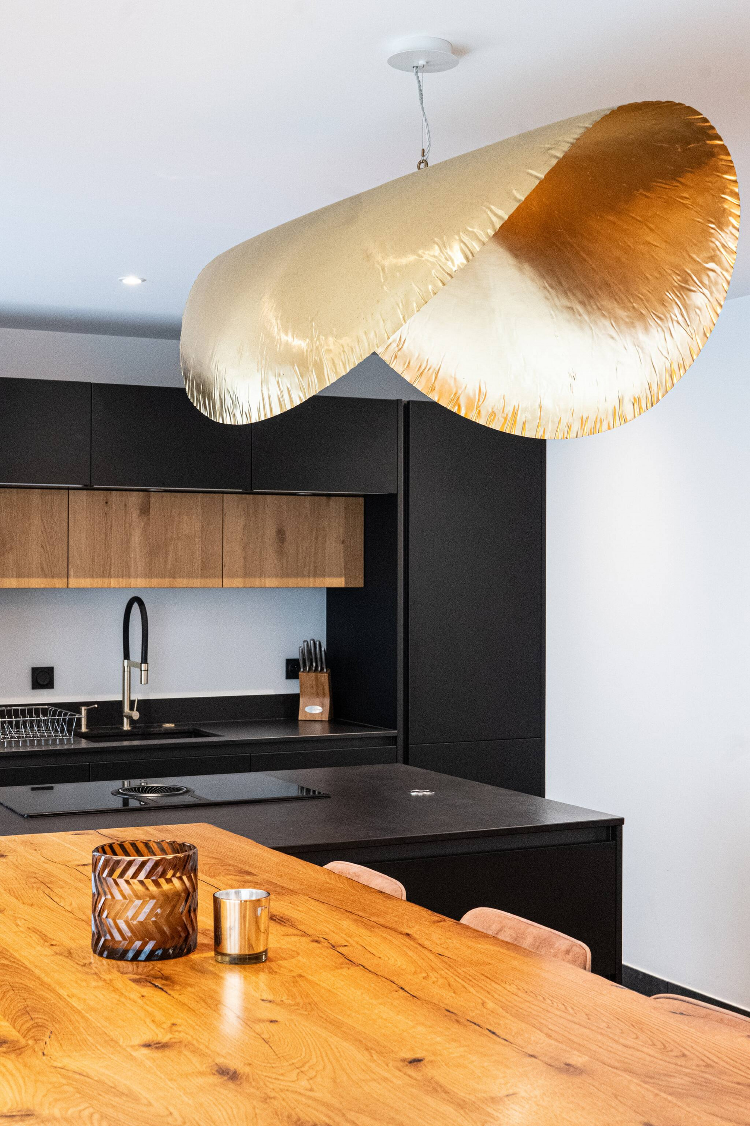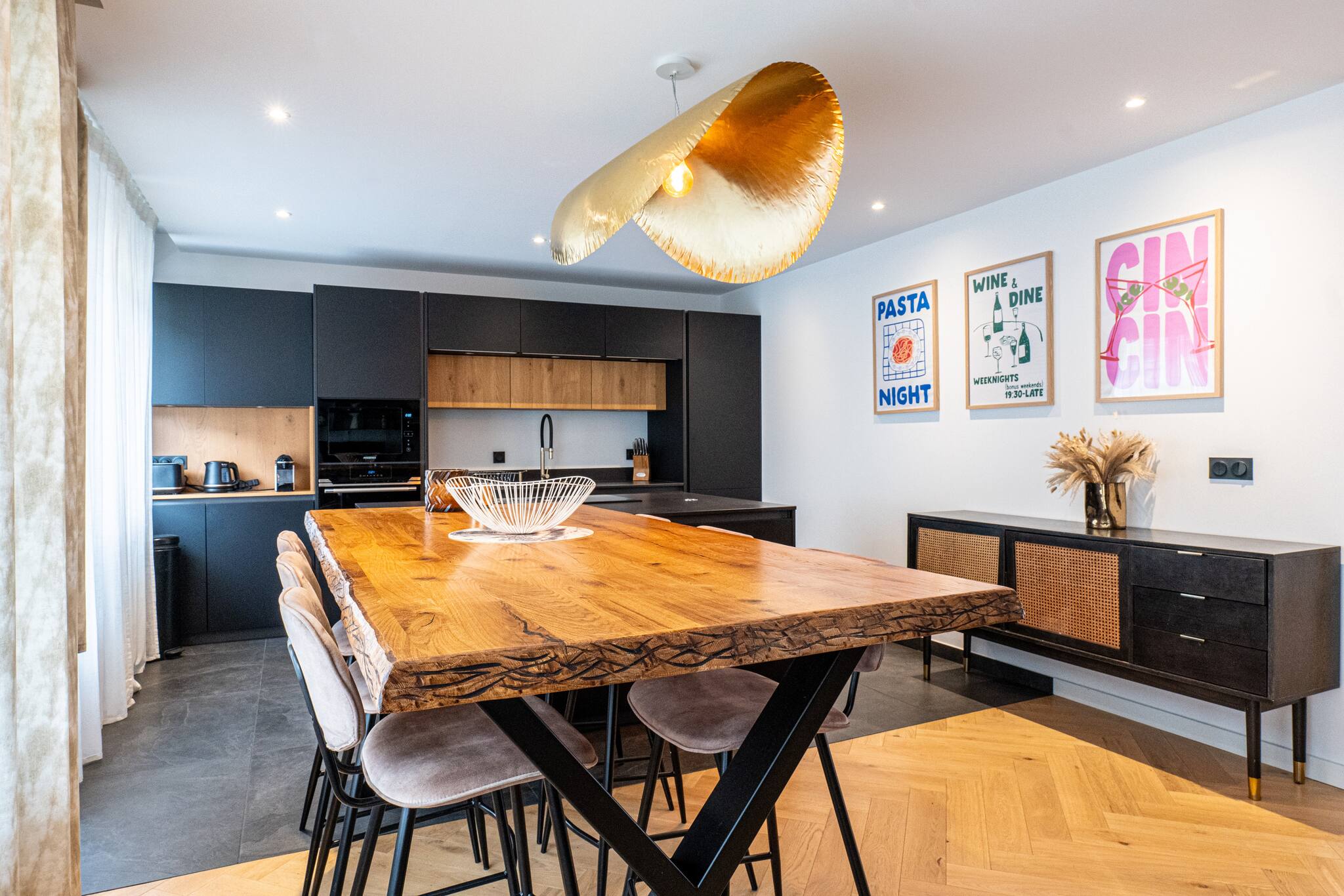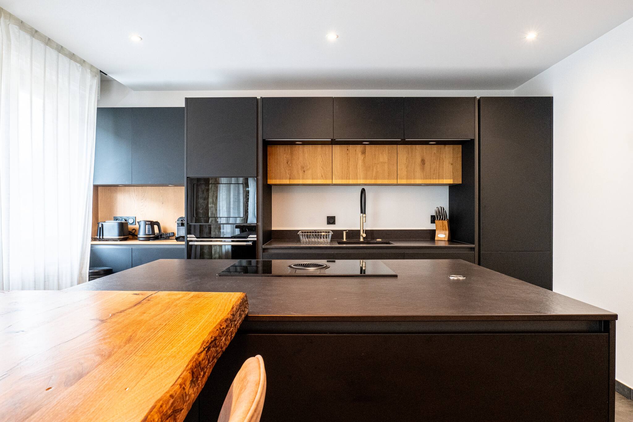 🍽️ Cuisine haut de gamme neuve, ouverte sur le salon, équipée de tout le nécessaire : réfrigérateur avec congélateur, four, four micro-ondes, lave-vaisselle, plaques de cuisson avec hotte intégrée, cafetière Nespresso, bouilloire, grille-pain... Vous pourrez savourer vos repas autour d'une magnifique table îlot en bois massif, pouvant accueillir jusqu'à 6 convives.