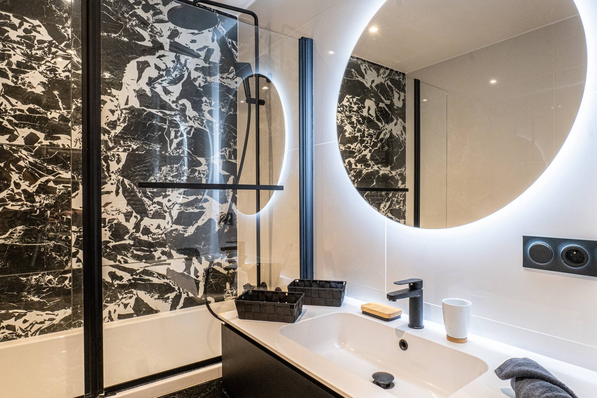 🛁 Salle de bain avec baignoire, grand meuble vasque avec miroir, sèche-serviettes, grand placard, sèche-cheveux, ainsi qu’un coin buanderie équipé d’un lave-linge et sèche-linge.