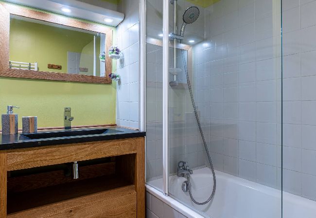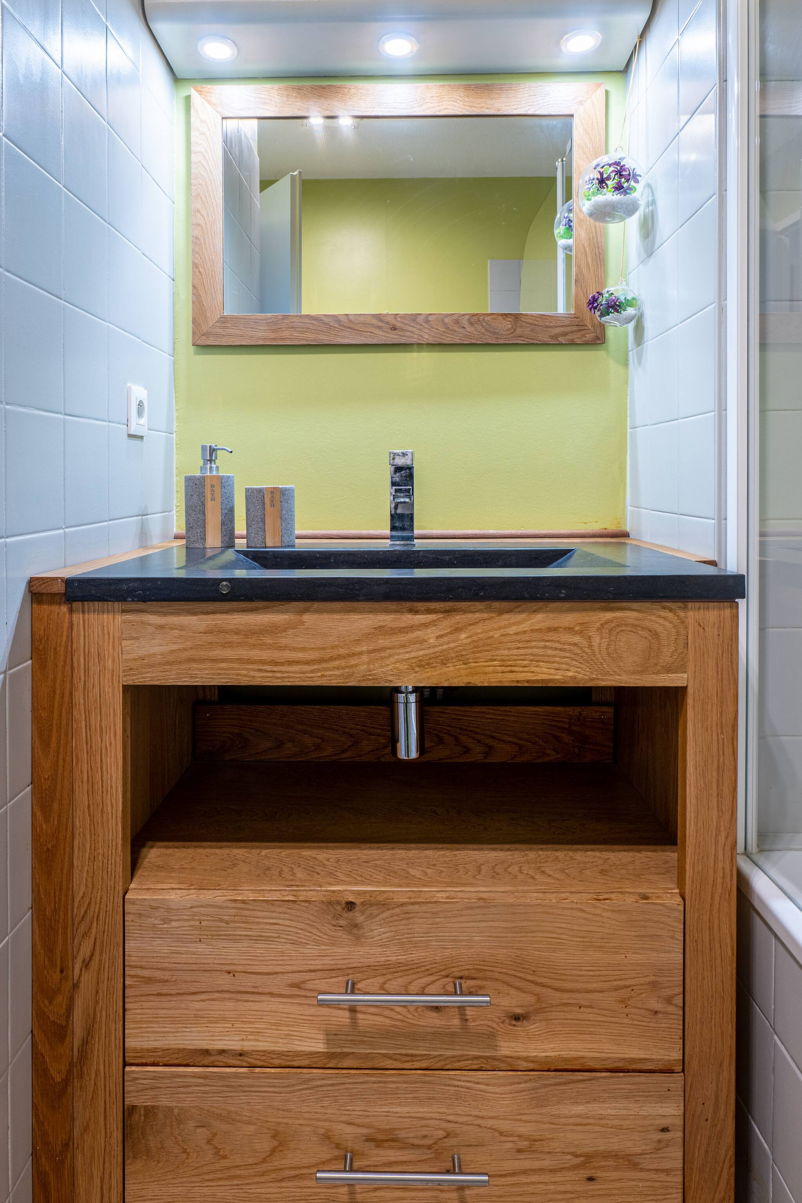 🛁 La salle de bain est équipée d’une grande douche à l’italienne, un meuble vasque avec miroir, sèche cheveux, sèche serviette et toilettes.