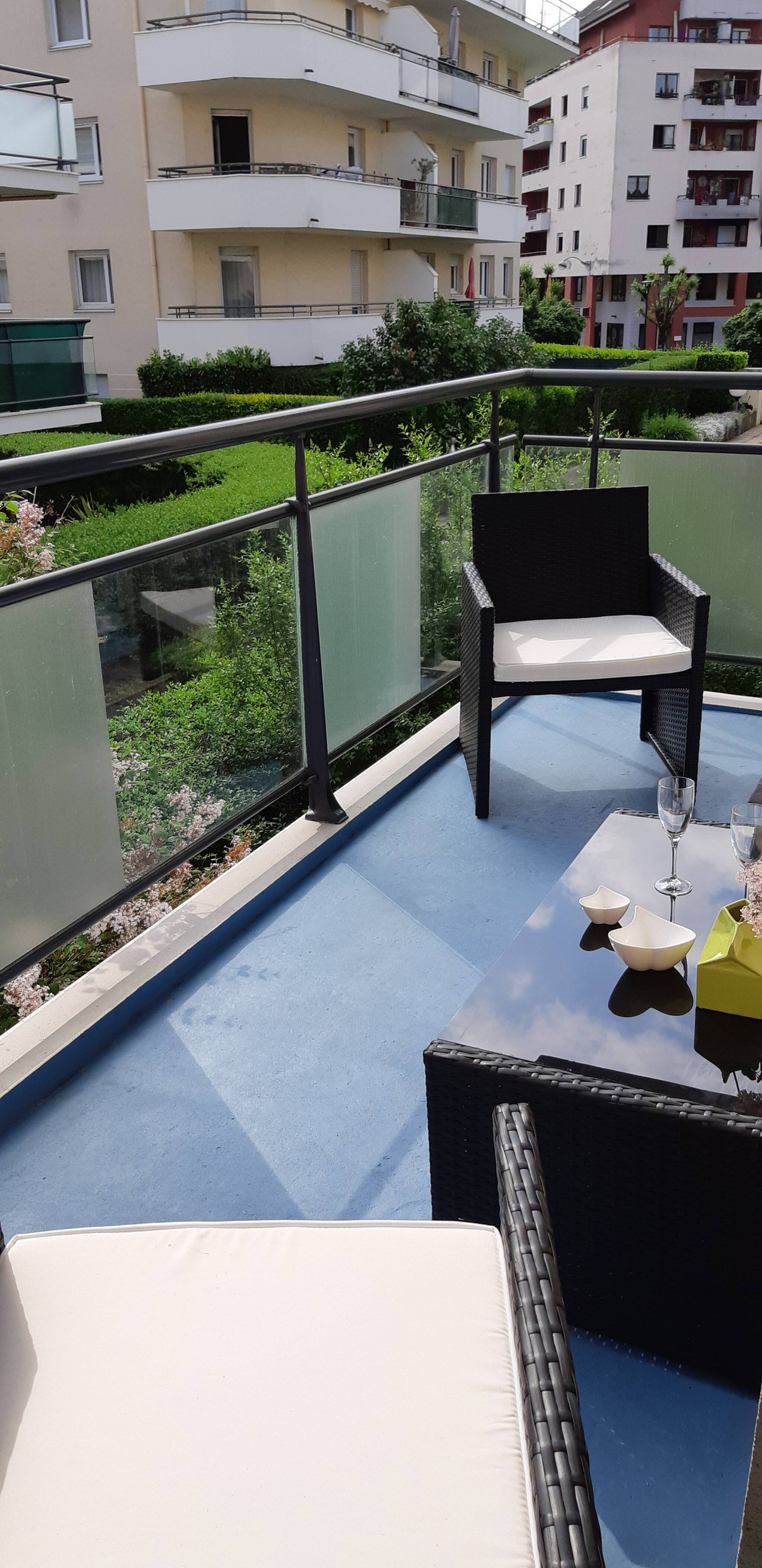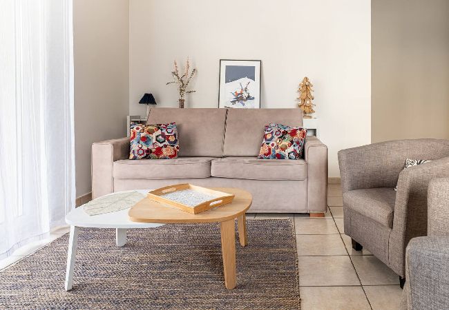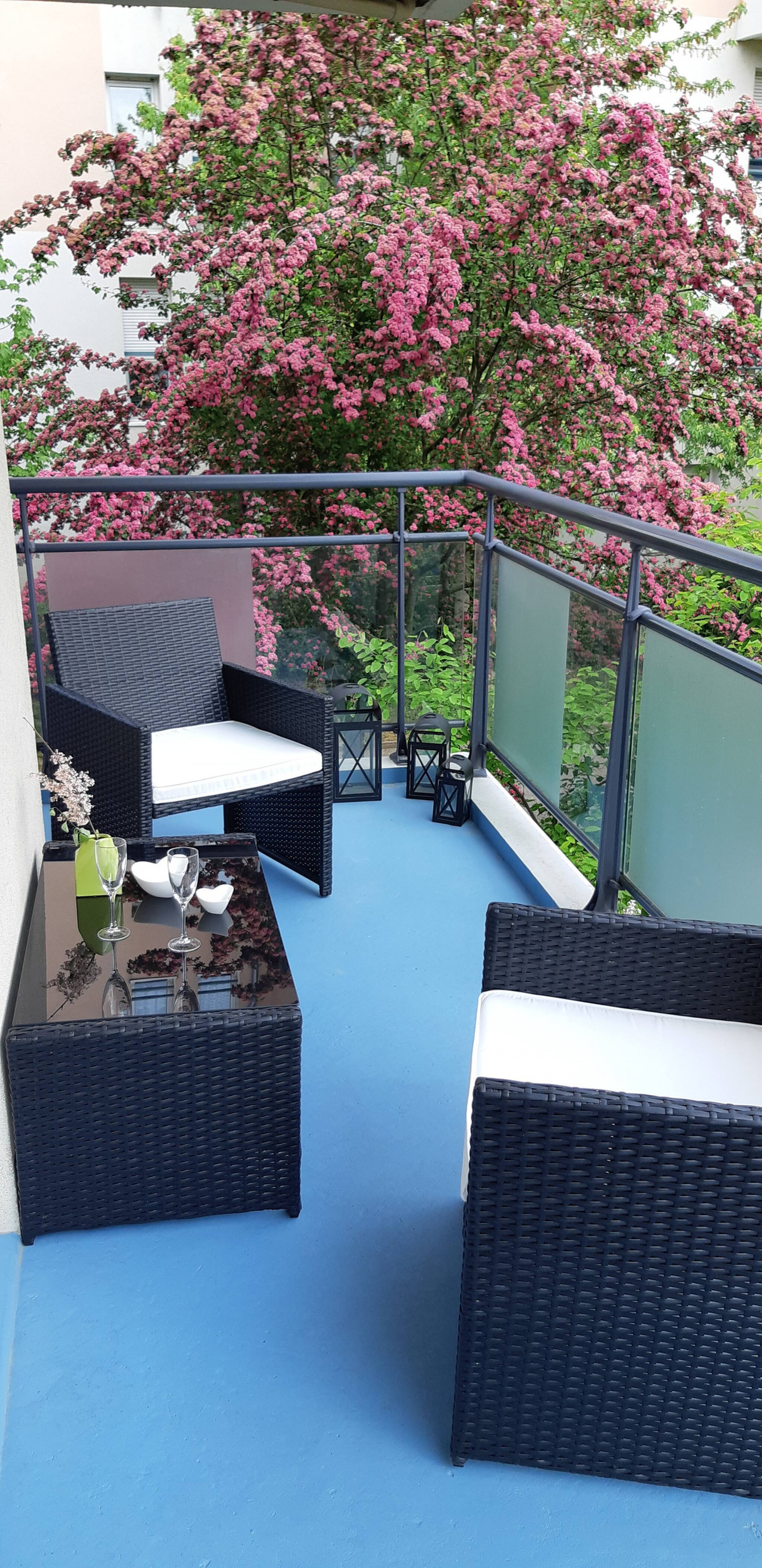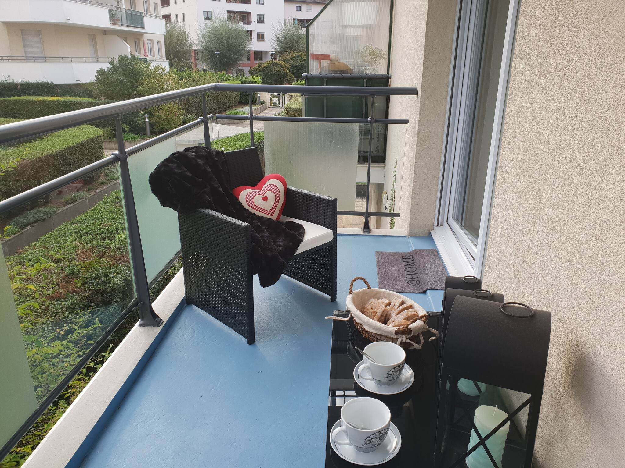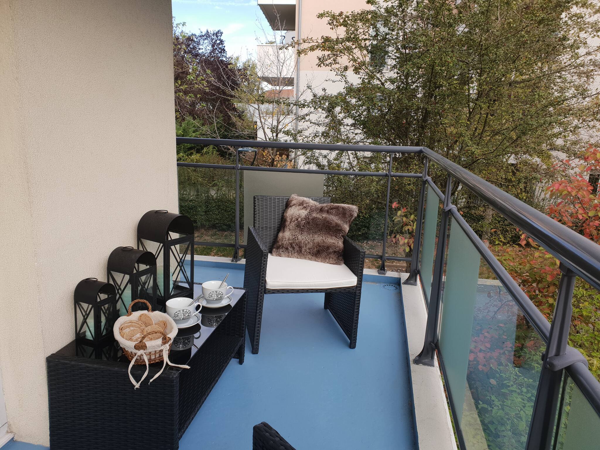 🛋️ Salon confortable avec une télévision, wifi , table basse, canapé et deux fauteuils. Il donne accès au balcon d'angle avec un salon de jardin et un barbecue électrique.