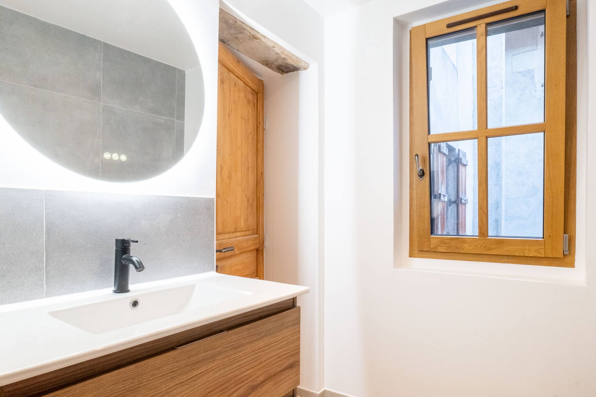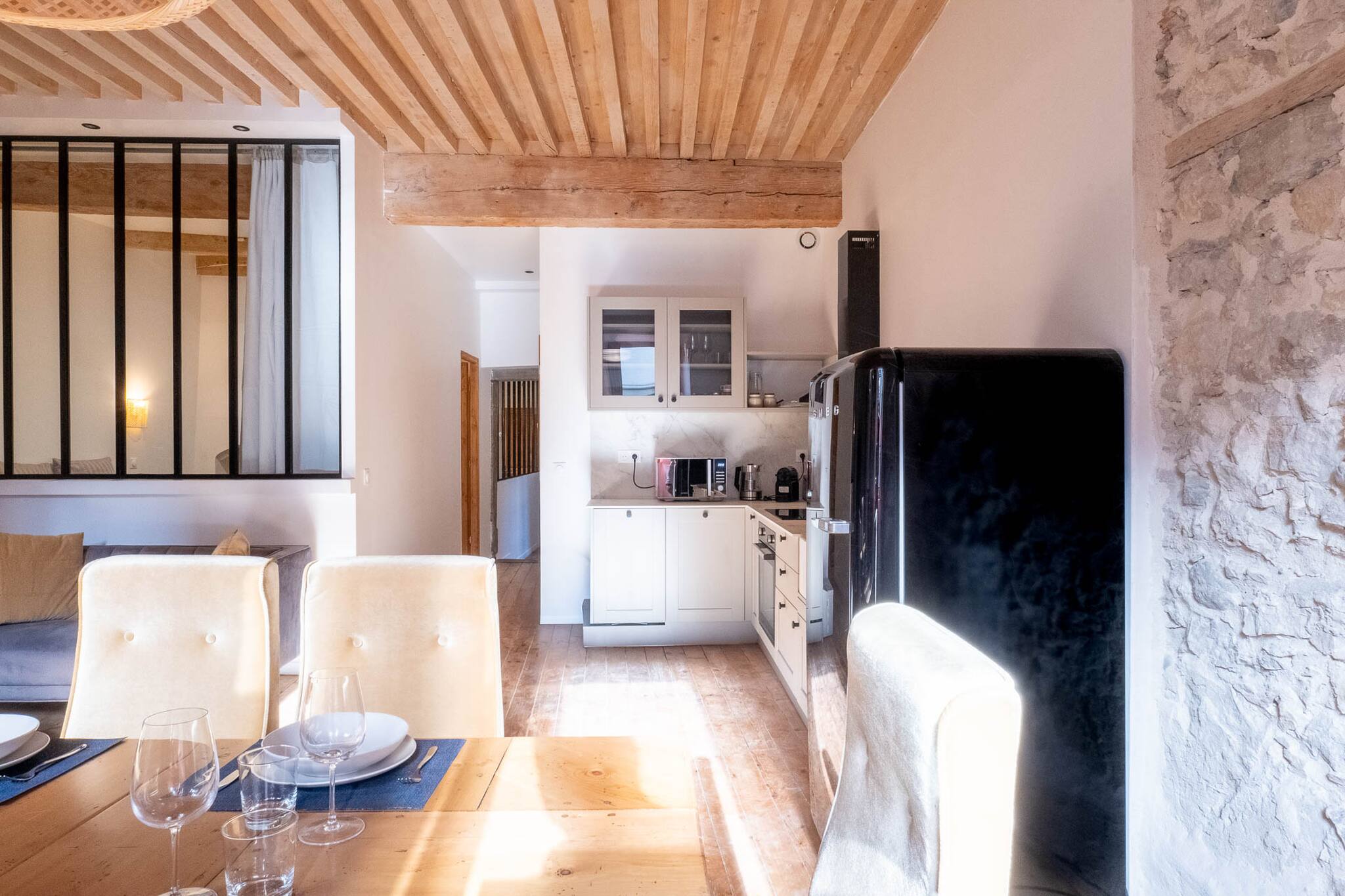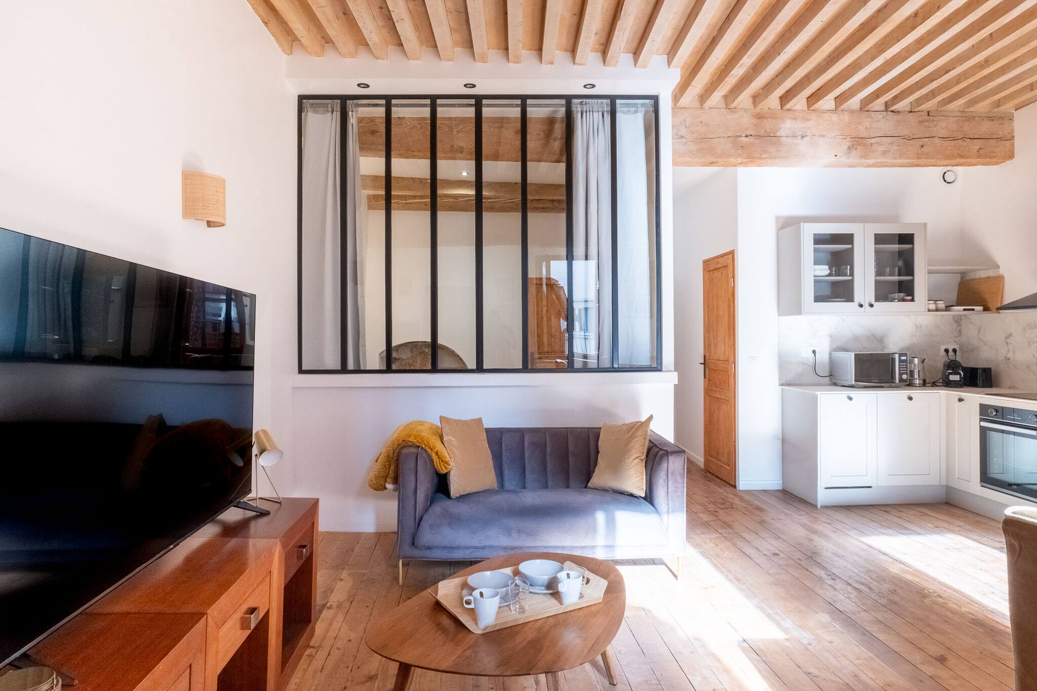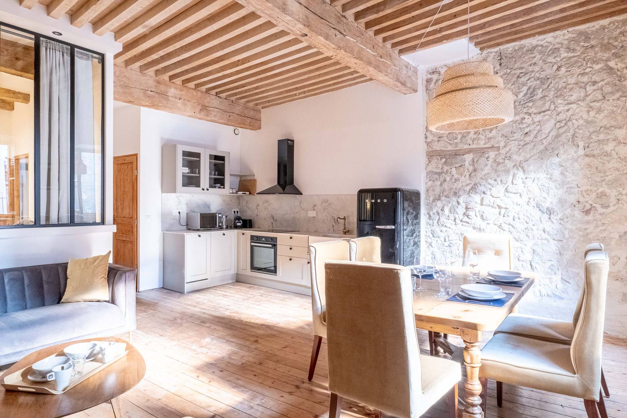 Situé rue Carnot, au cœur de la vieille ville piétonne, cet appartement spacieux offre un cadre accueillant et plein de caractère. Les pierres apparentes et la grande pièce de vie créent une ambiance chaleureuse et conviviale.
