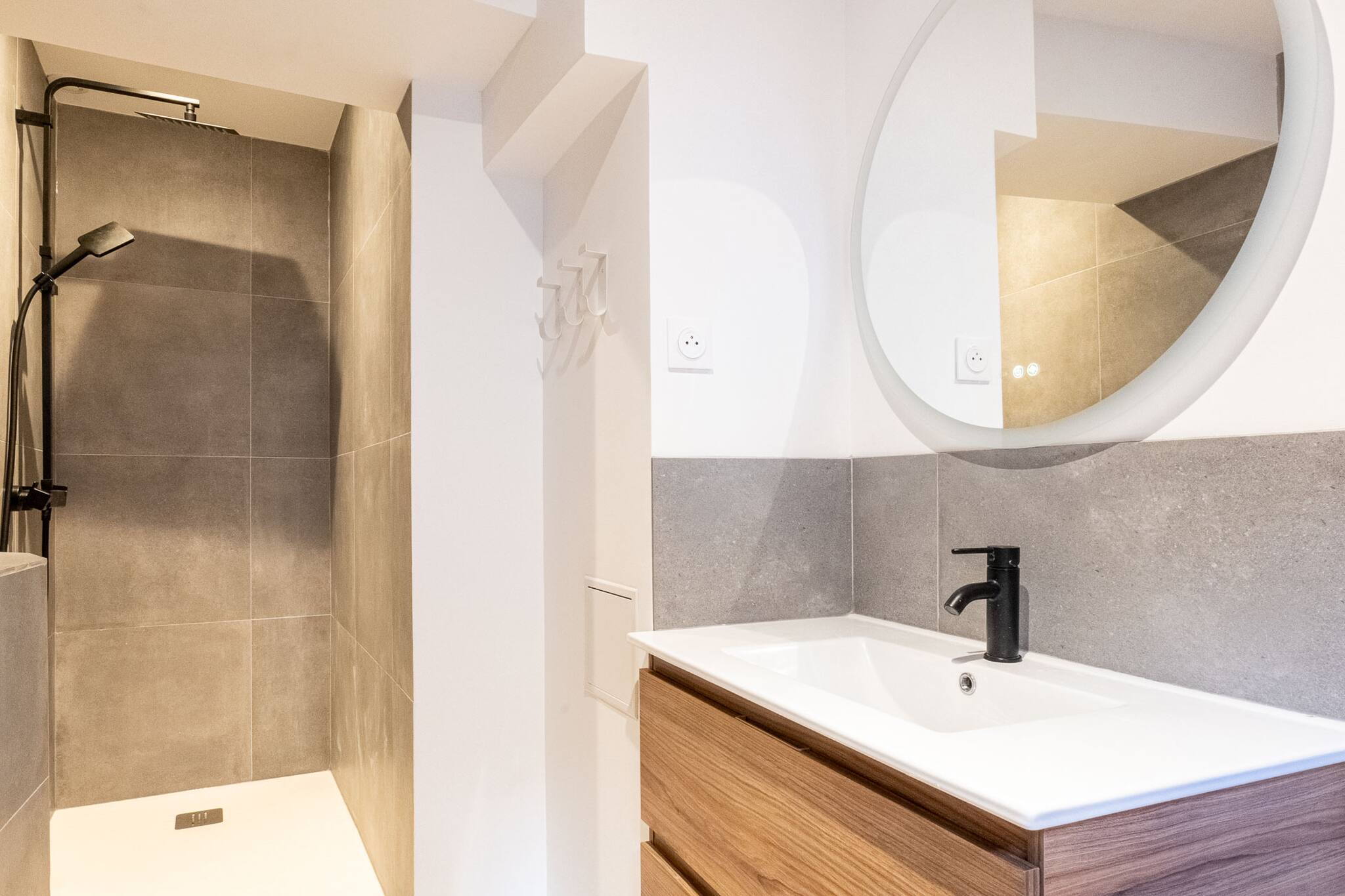 🛁 La salle de bain est équipée d’une douche, meuble vasque avec miroir et d’une machine à laver.