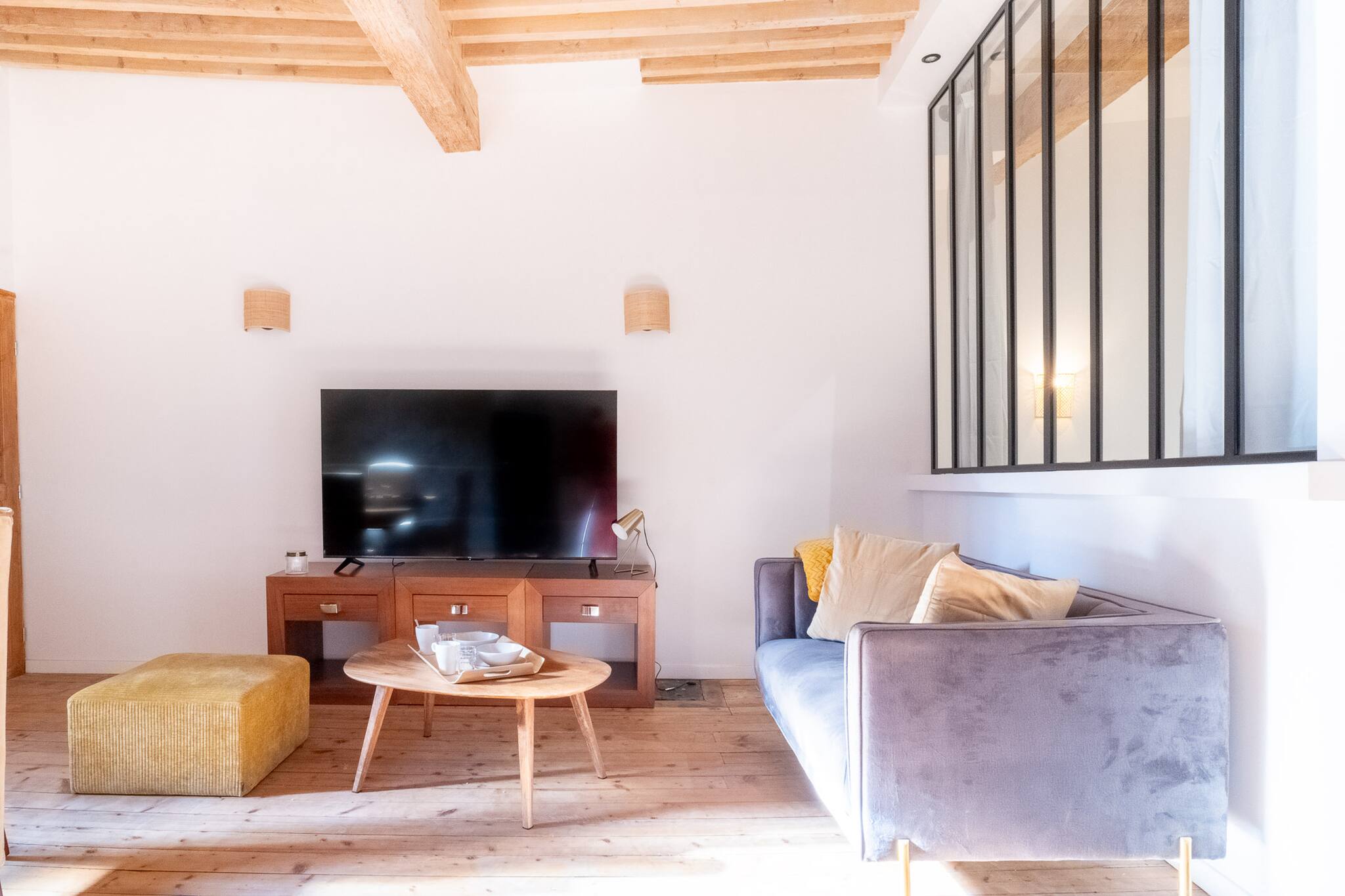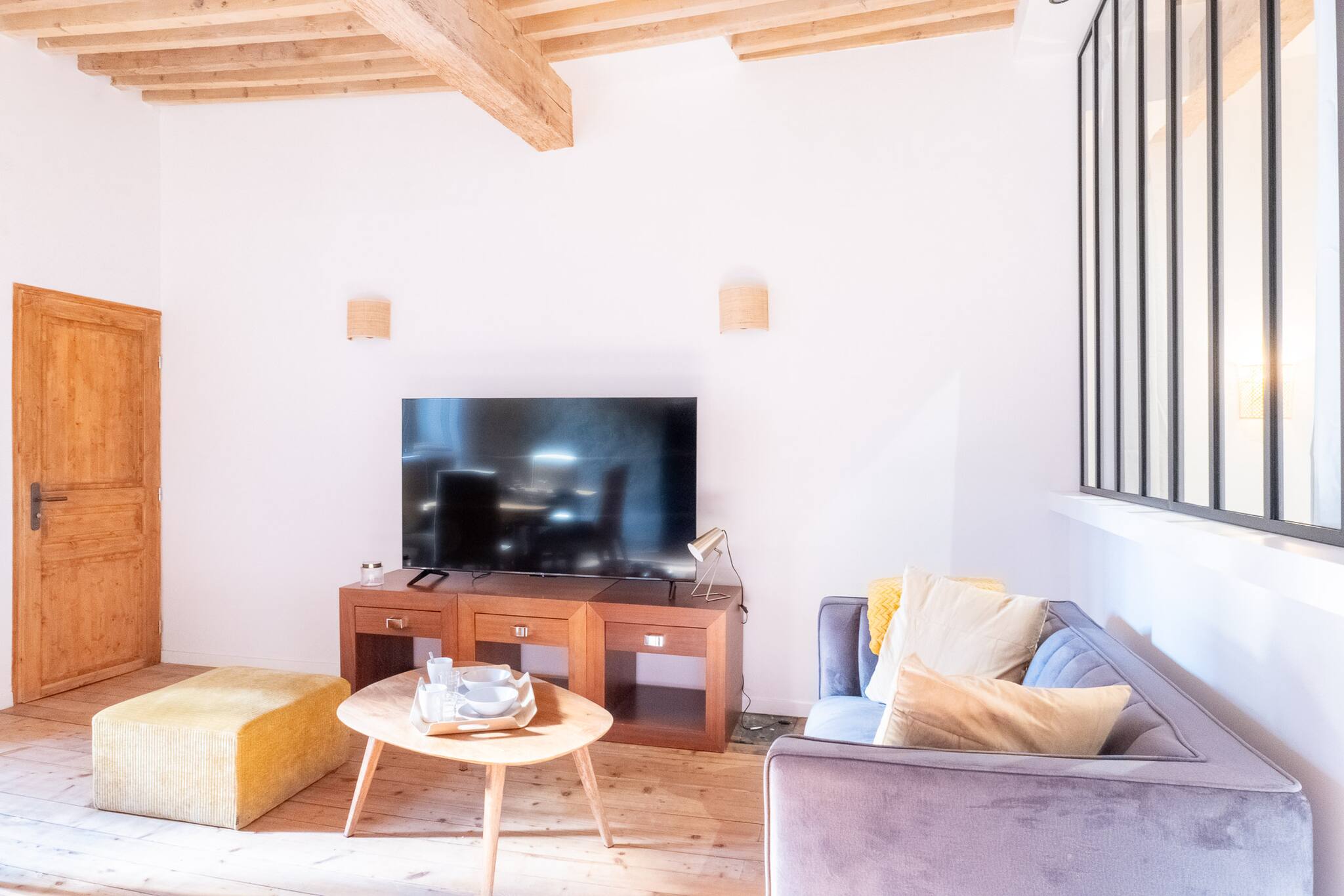 🛋️ Un salon cosy avec canapé, TV connectée 📺 et connexion Internet rapide 🌐