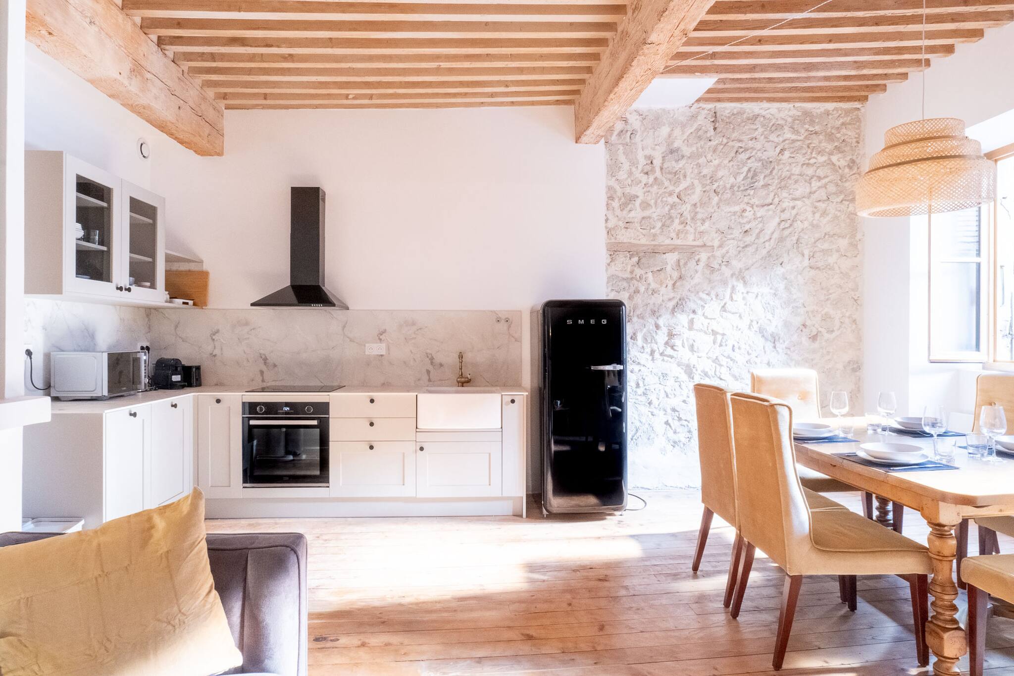 🛋️ La grande table en bois invite à partager vos repas 🍷, tandis que le canapé confortable 🛋️ est parfait pour se détendre après une journée de visites.