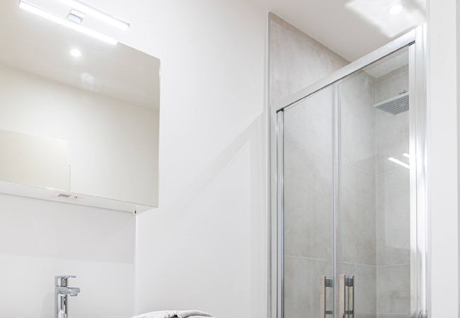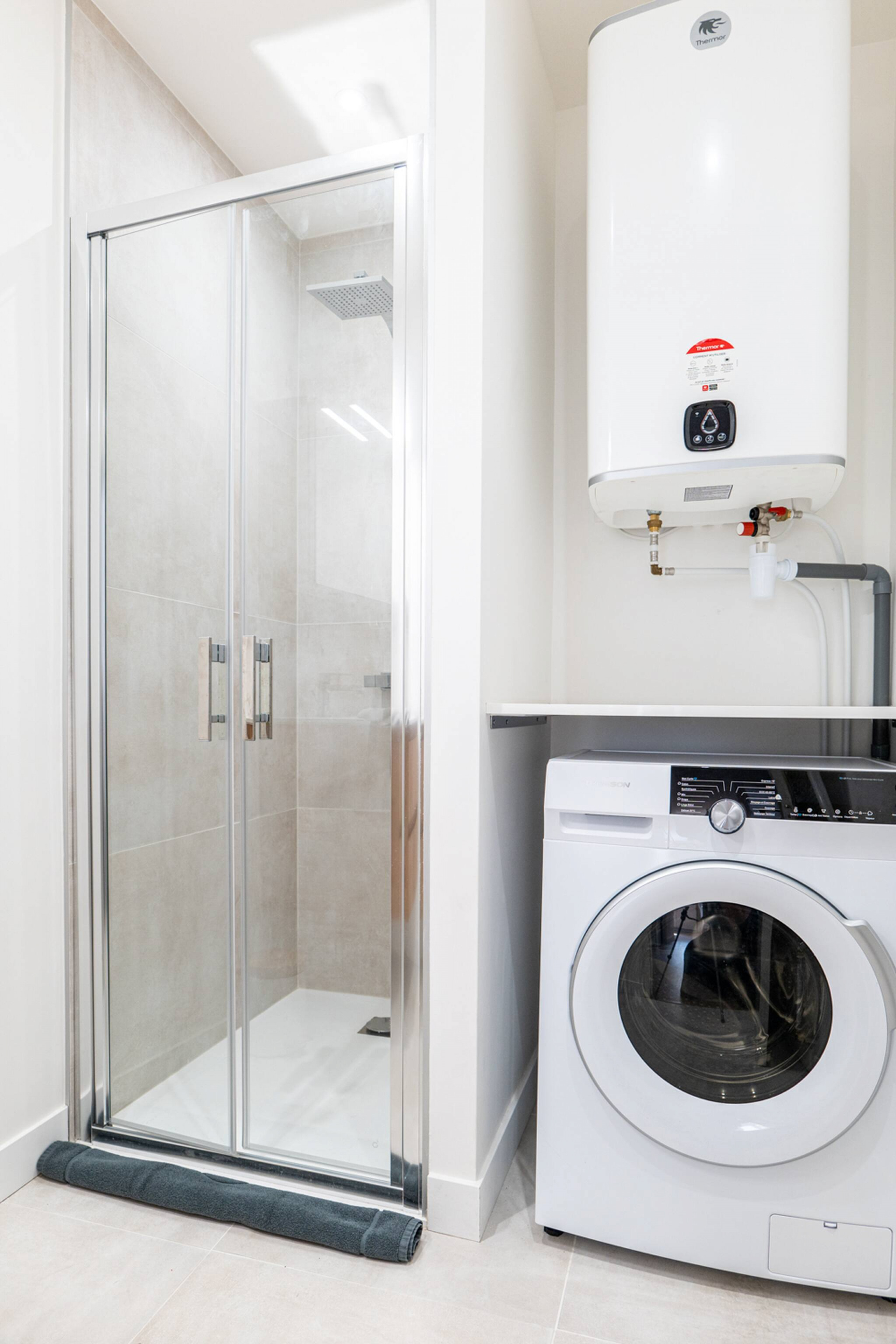 🛁 La salle de bain est équipée d’une douche, meuble vasque avec miroir et d’une machine à laver.