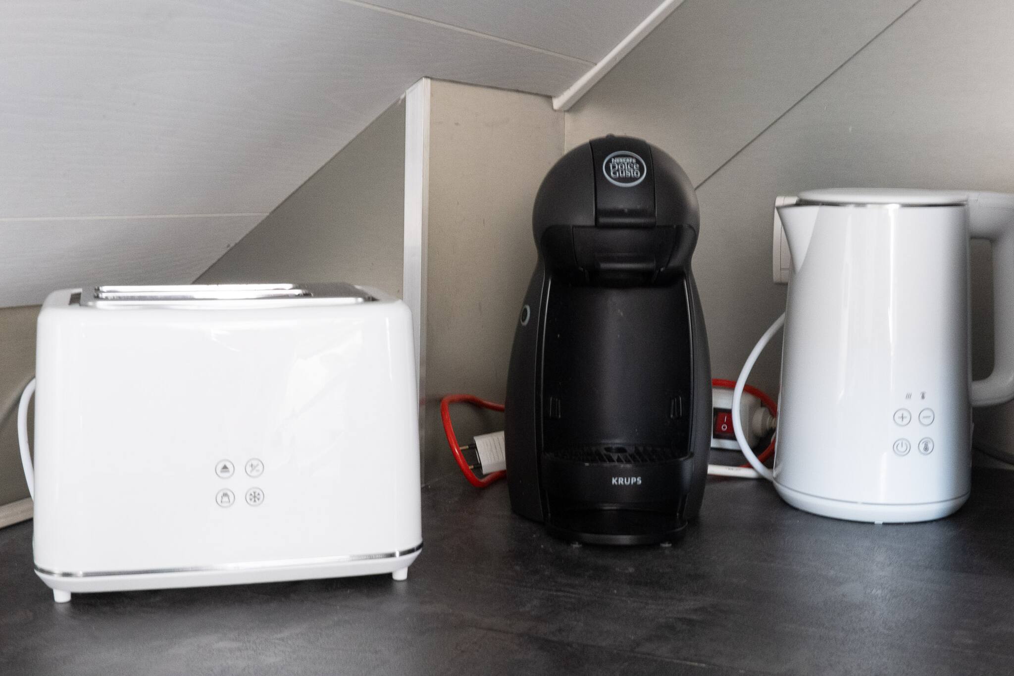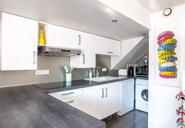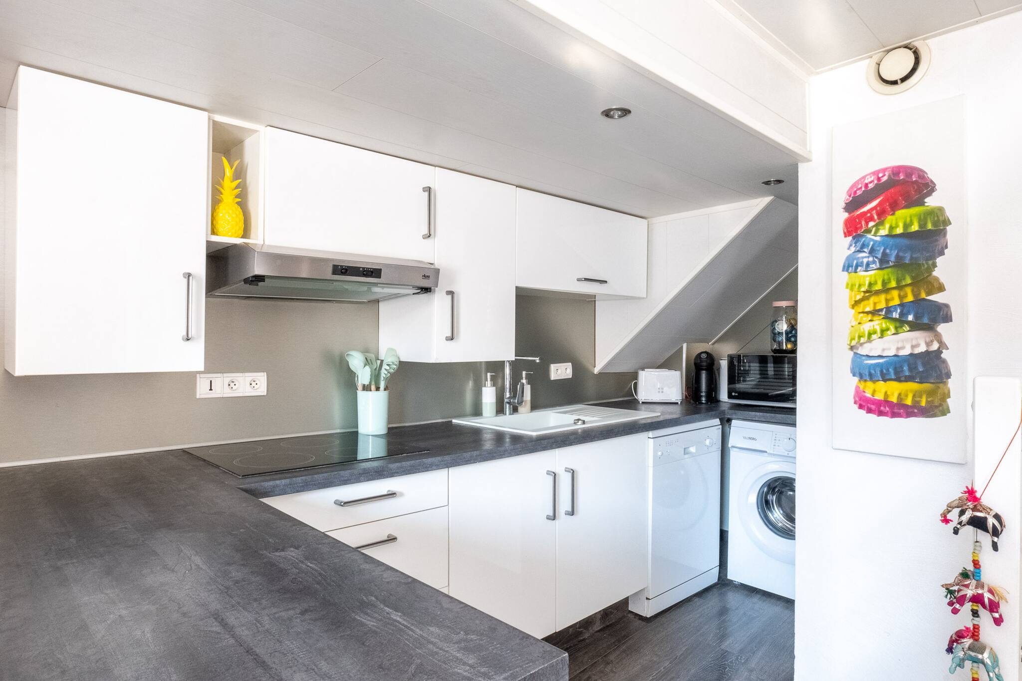🍽️ Cuisine ouverte sur le salon. Equipée d’un réfrigérateur et congélateur, four, micro onde, lave vaisselle, plaques de cuisson, grille pain, cafetière Nespresso, bouilloire, table à manger pour 4 personnes)