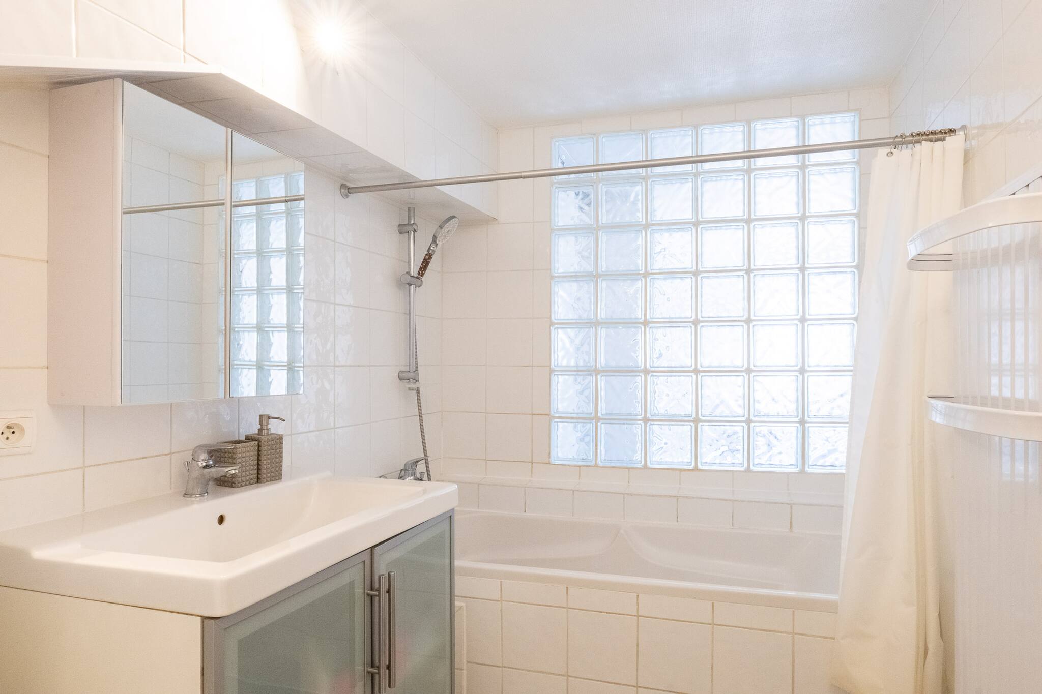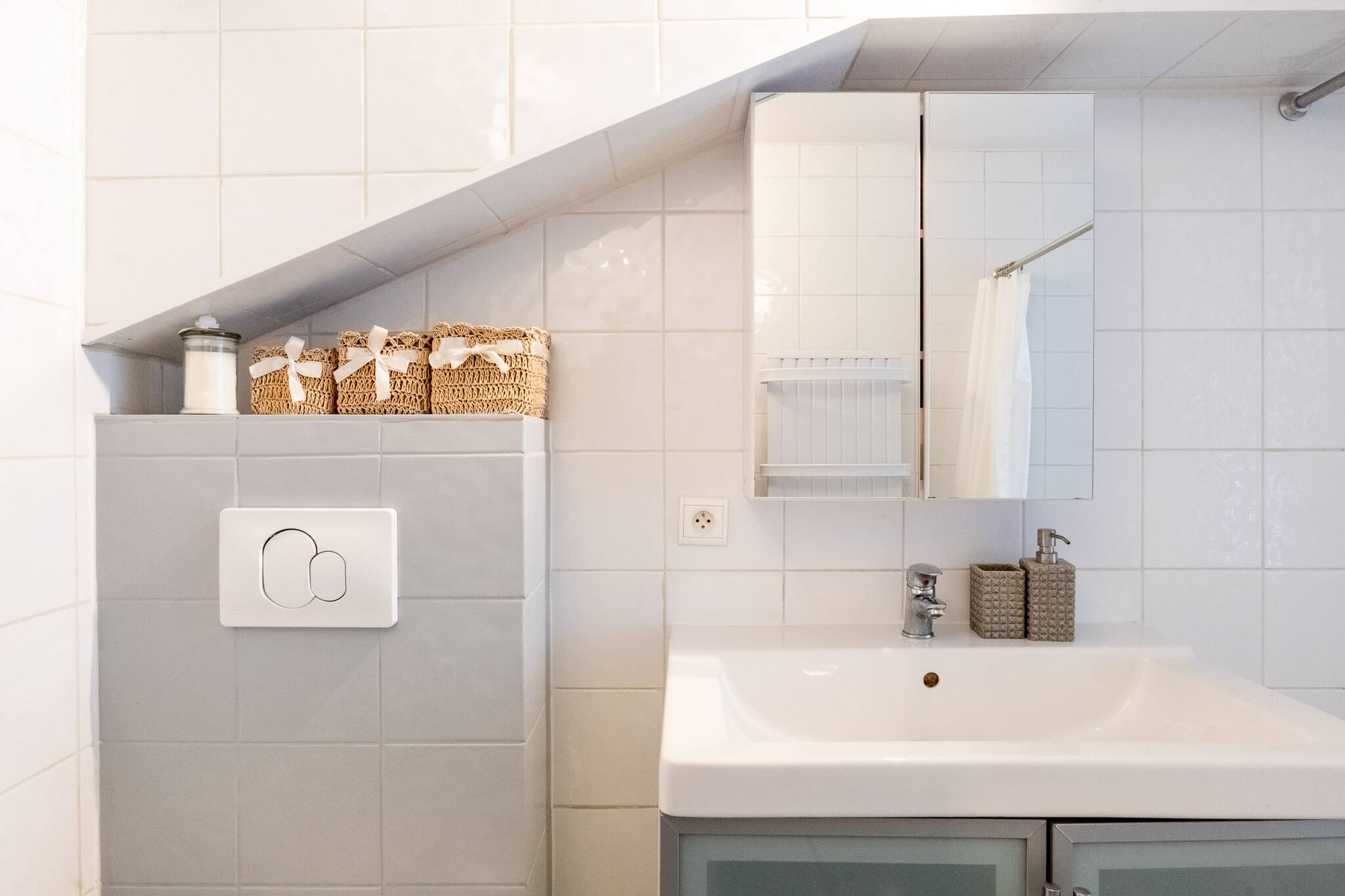 🛁 La salle de bain est équipée d’une douche, meuble vasque avec miroir et d’une machine à laver.