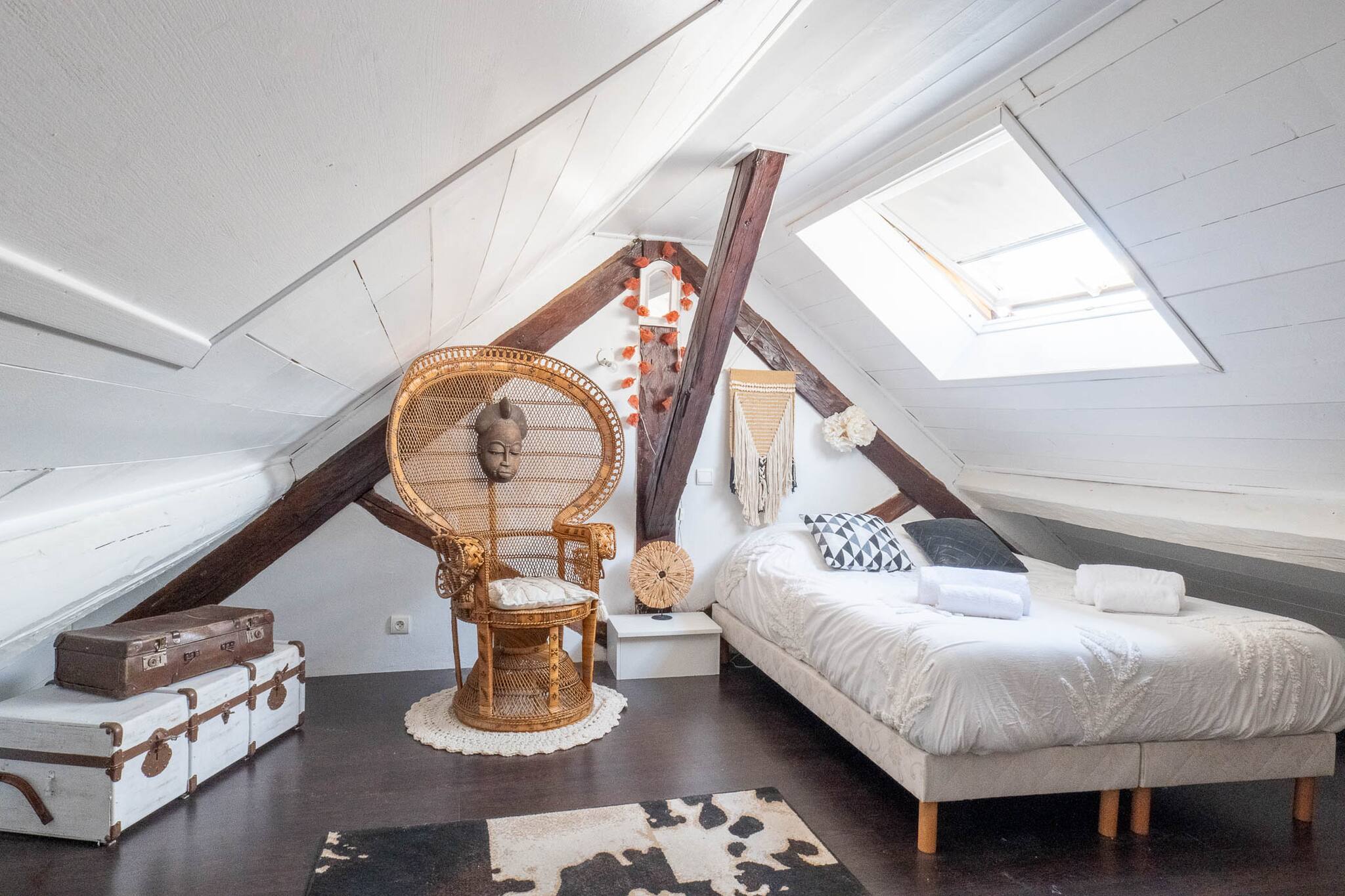 🛏️ À l’étage : une grande chambre mansardée avec fenêtre de toit 🌤️, ambiance cocooning garantie sous les poutres apparentes.