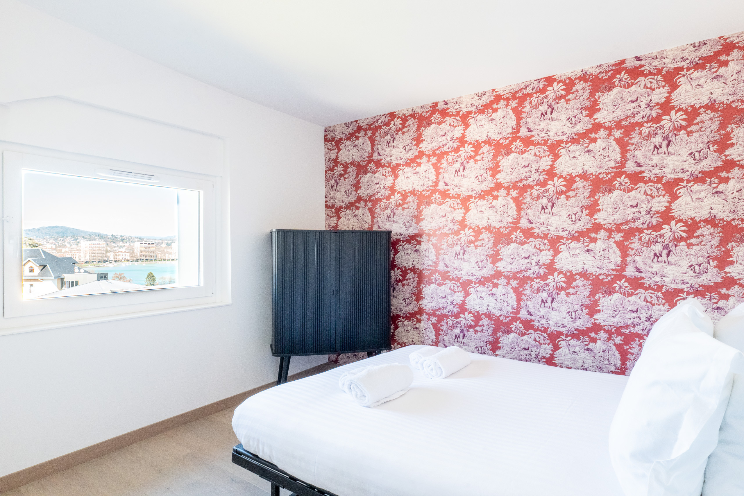 🛏️ La Suite parentale avec fenêtre offrant une vue dégagée sur le lac et la ville vous propose un lit 160 cm, une salle de bain privative avec douche, sèche serviettes, sèche-cheveux, meuble vasque, placard.