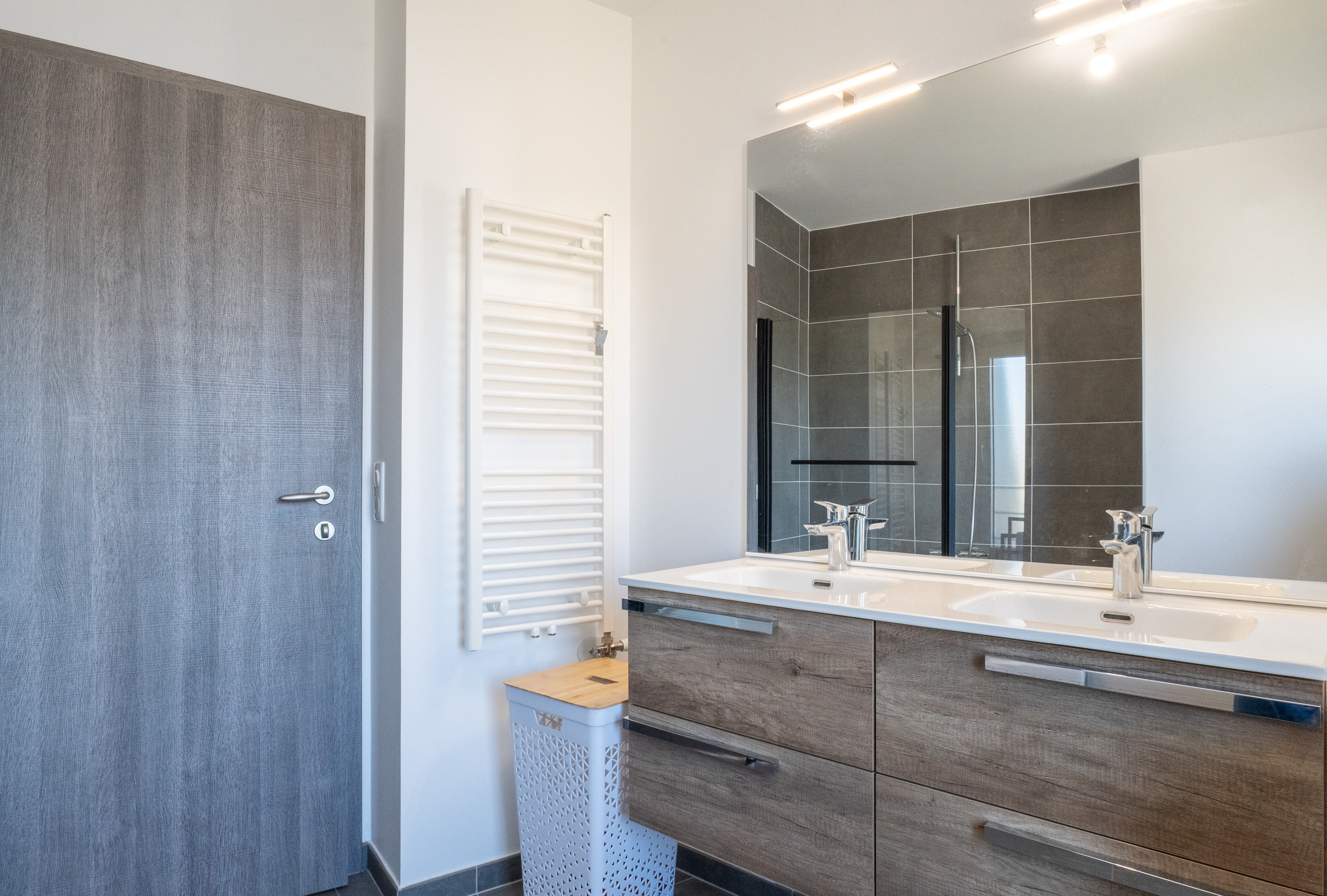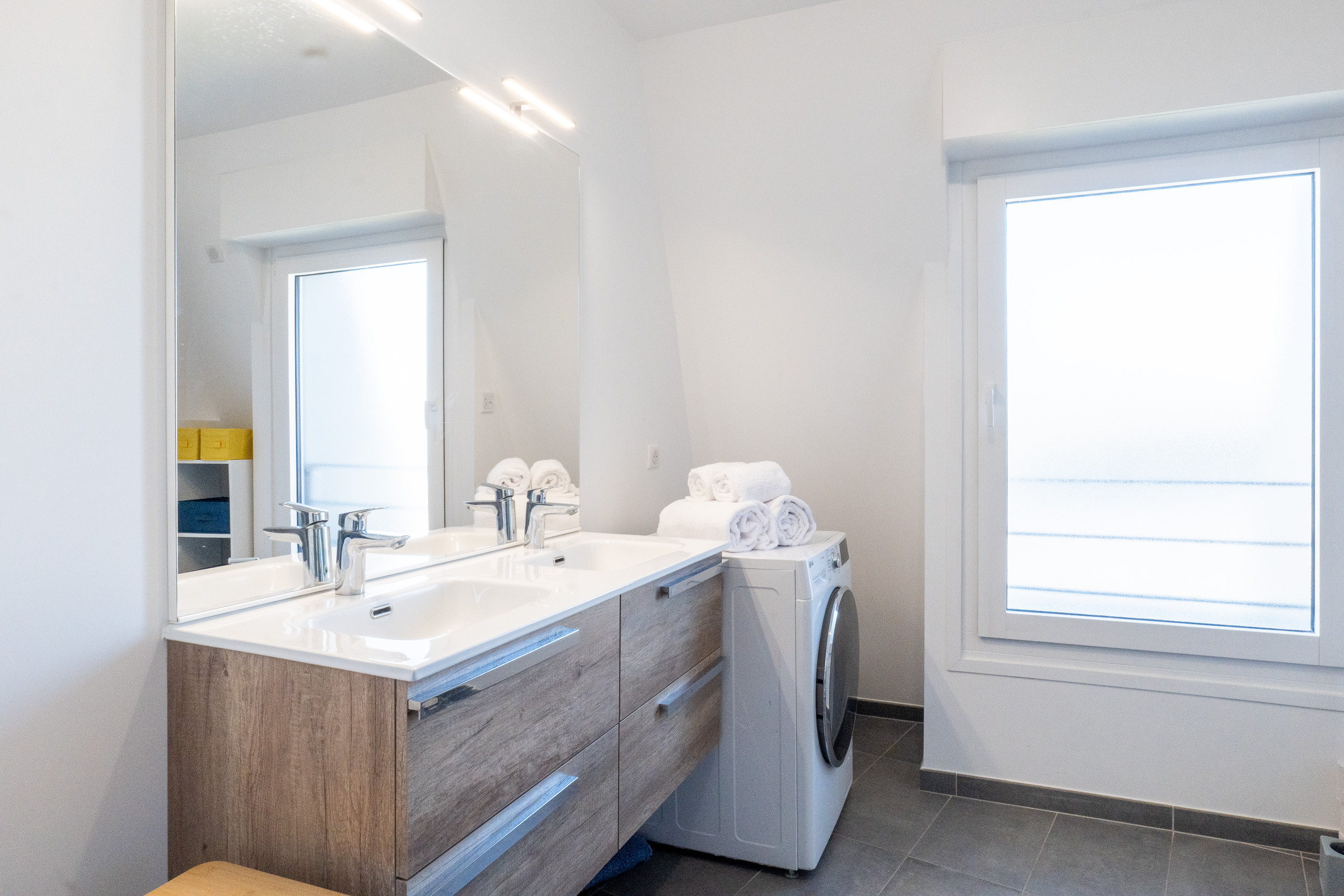 🛁La salle de bain de cet étage est équipée d’une baignoire, meuble double vasque, miroir et sèche-cheveux 💆♀️.