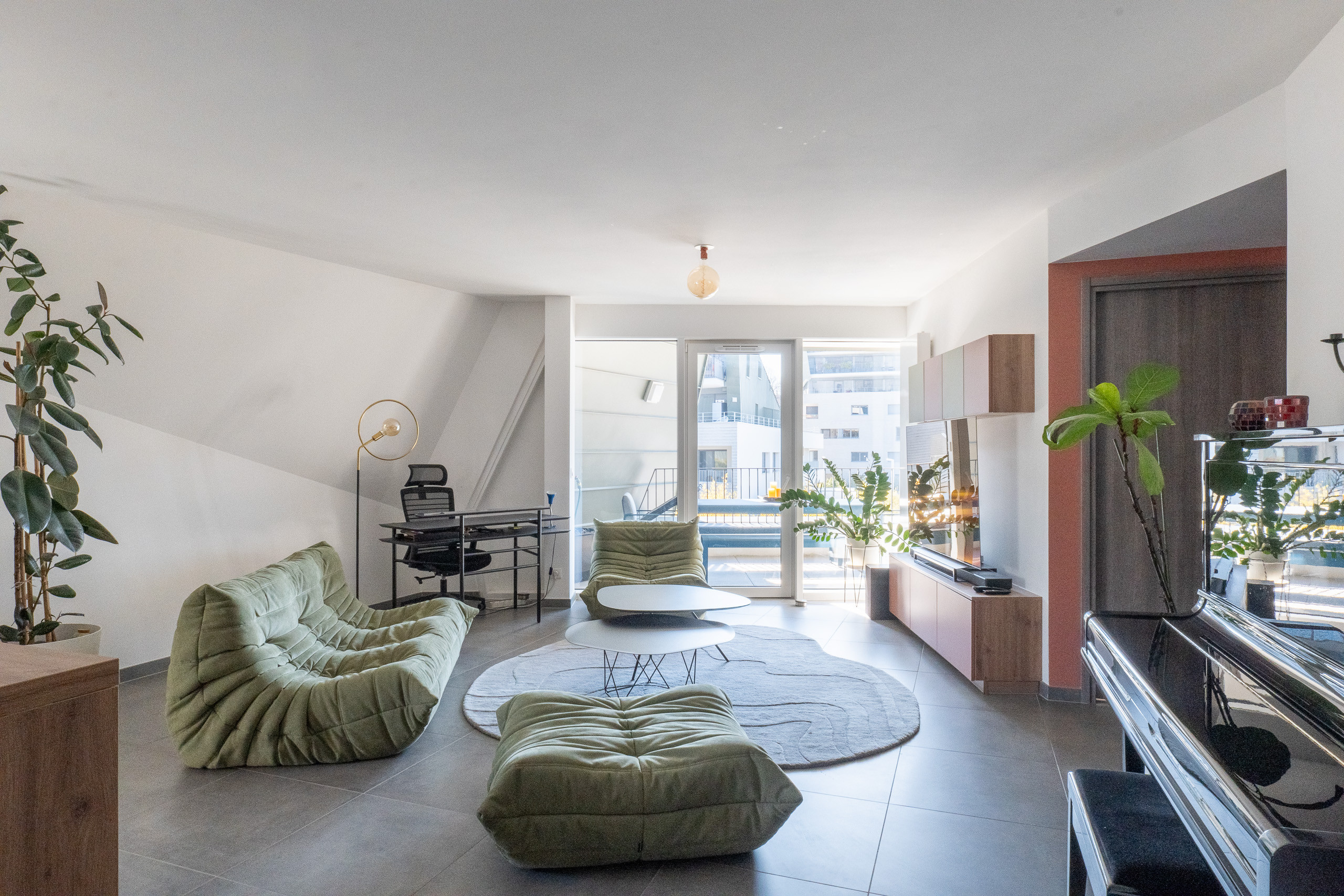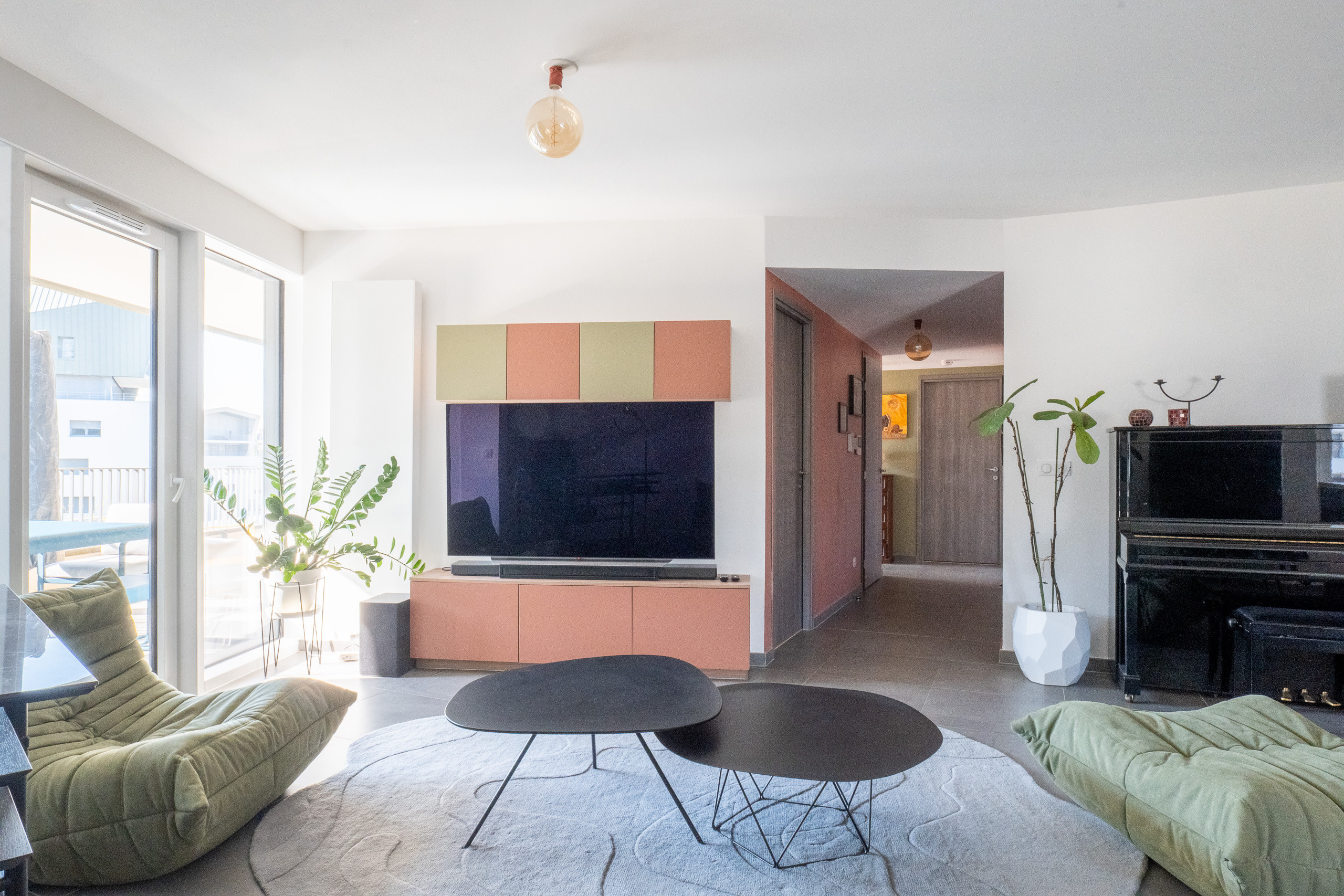 Grand salon lumineux avec espace bureau, télévision connectée avec barre de son, enceinte Bluetooth, lecteur DVD, canapé design. Un piano est également à disposition (à manipuler avec précaution), apportant une touche artistique rare.