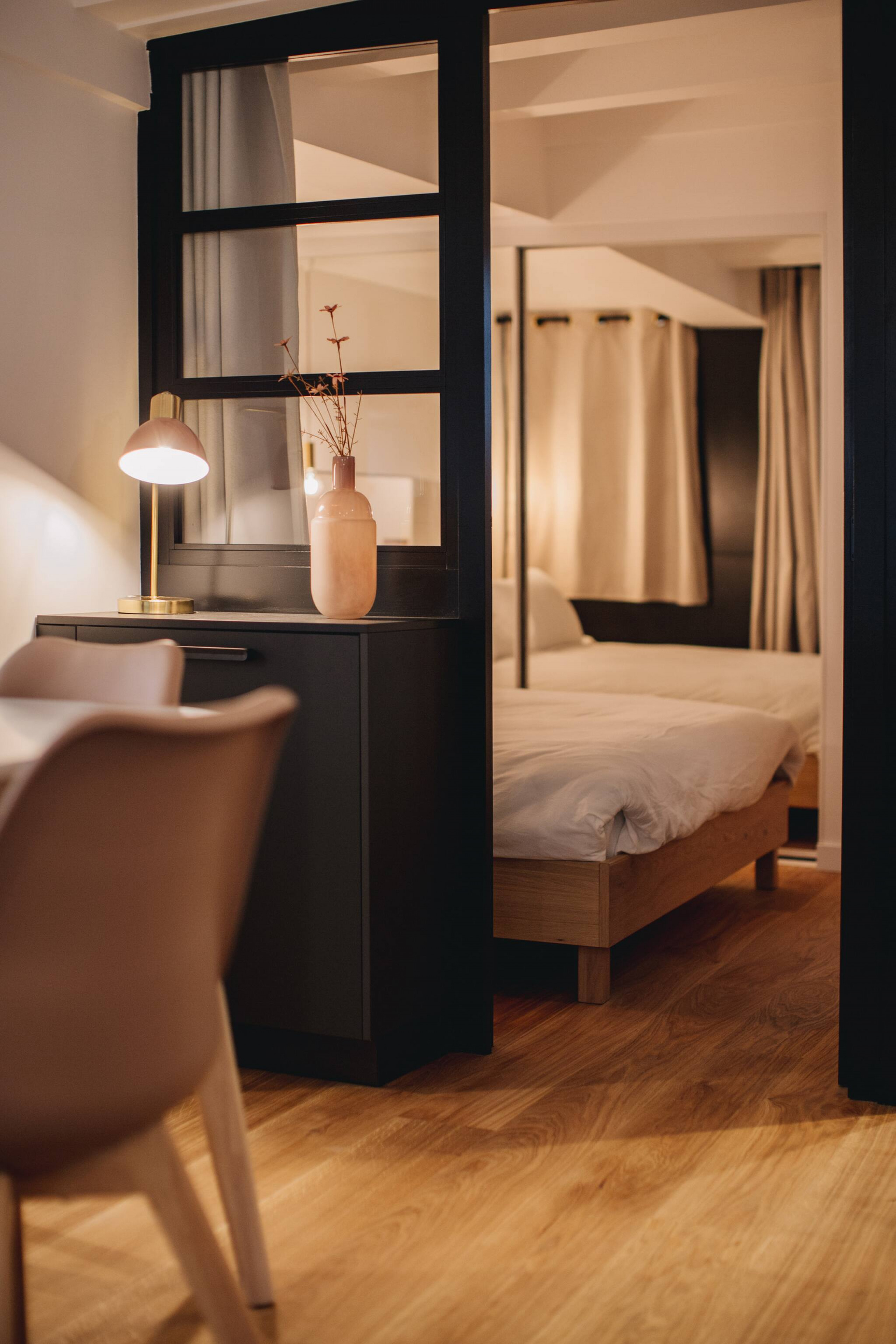 🛏️ La chambre séparée dispose d’un lit double et d’un coin bureau, parfaite pour se détendre ou télétravailler en toute sérénité 💻