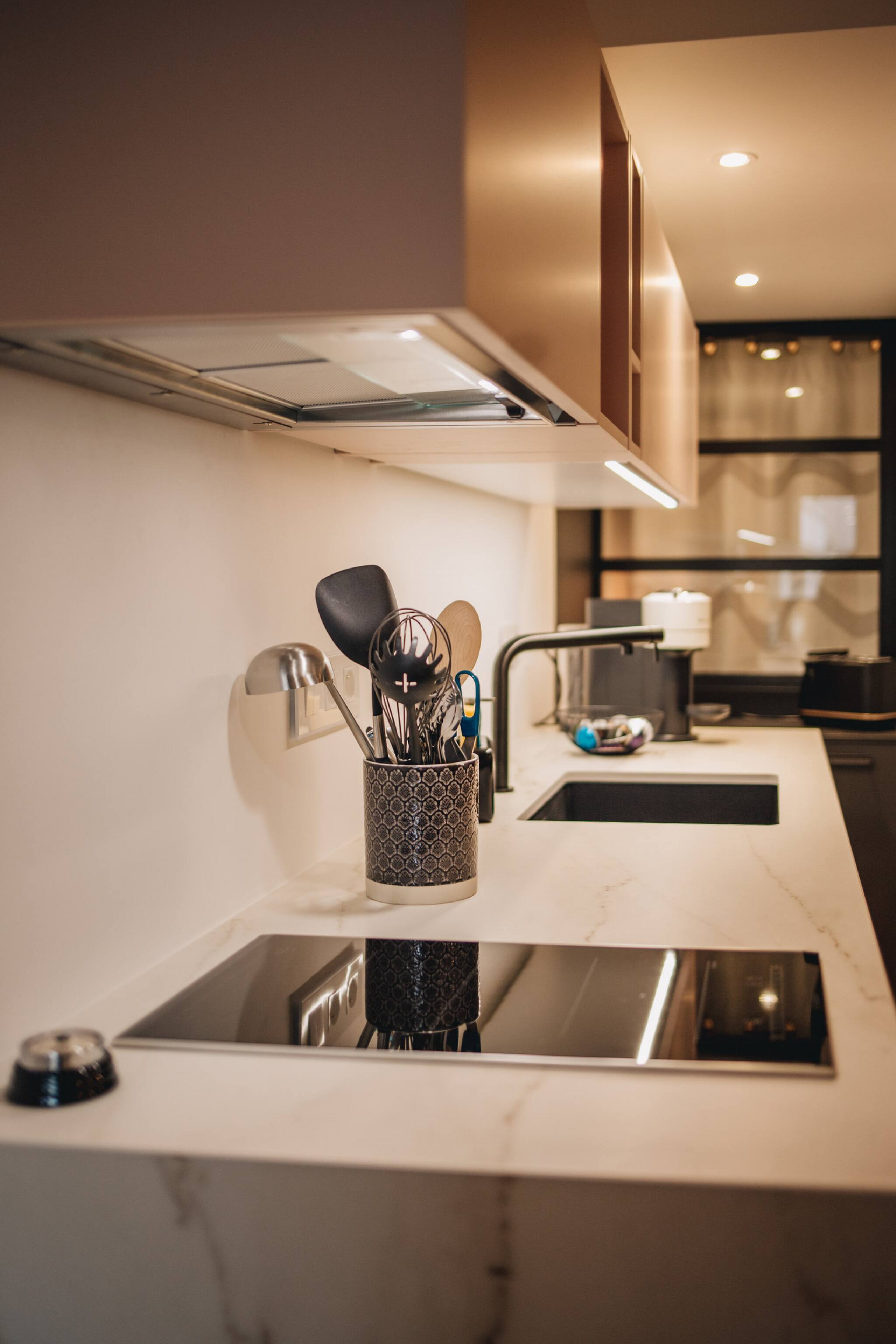 🍽️ Cuisine ouverte sur le salon. Equipée d’un réfrigérateur, Four combiné / micro-ondes, lave vaisselle, plaques de cuisson induction, hotte,