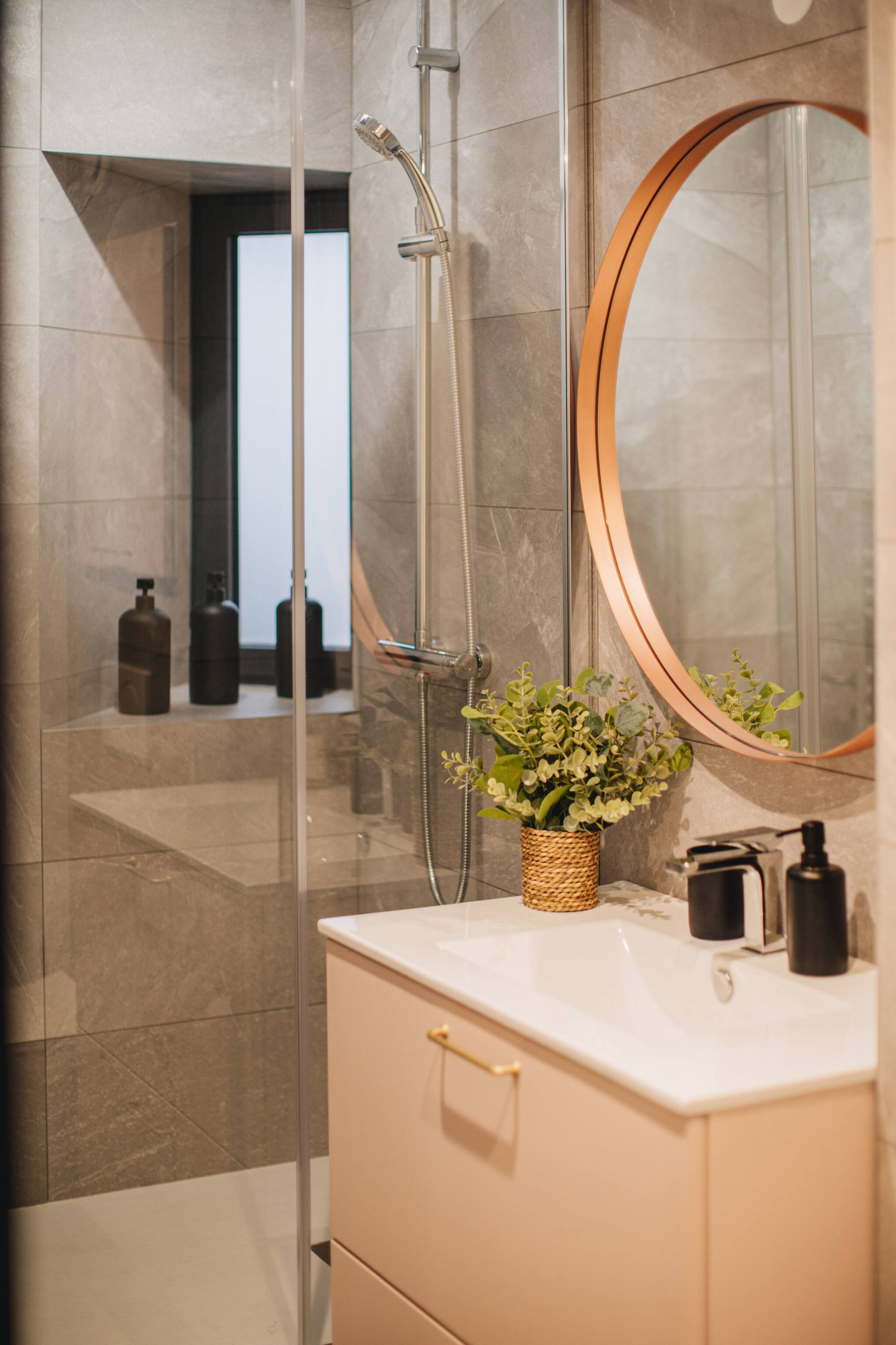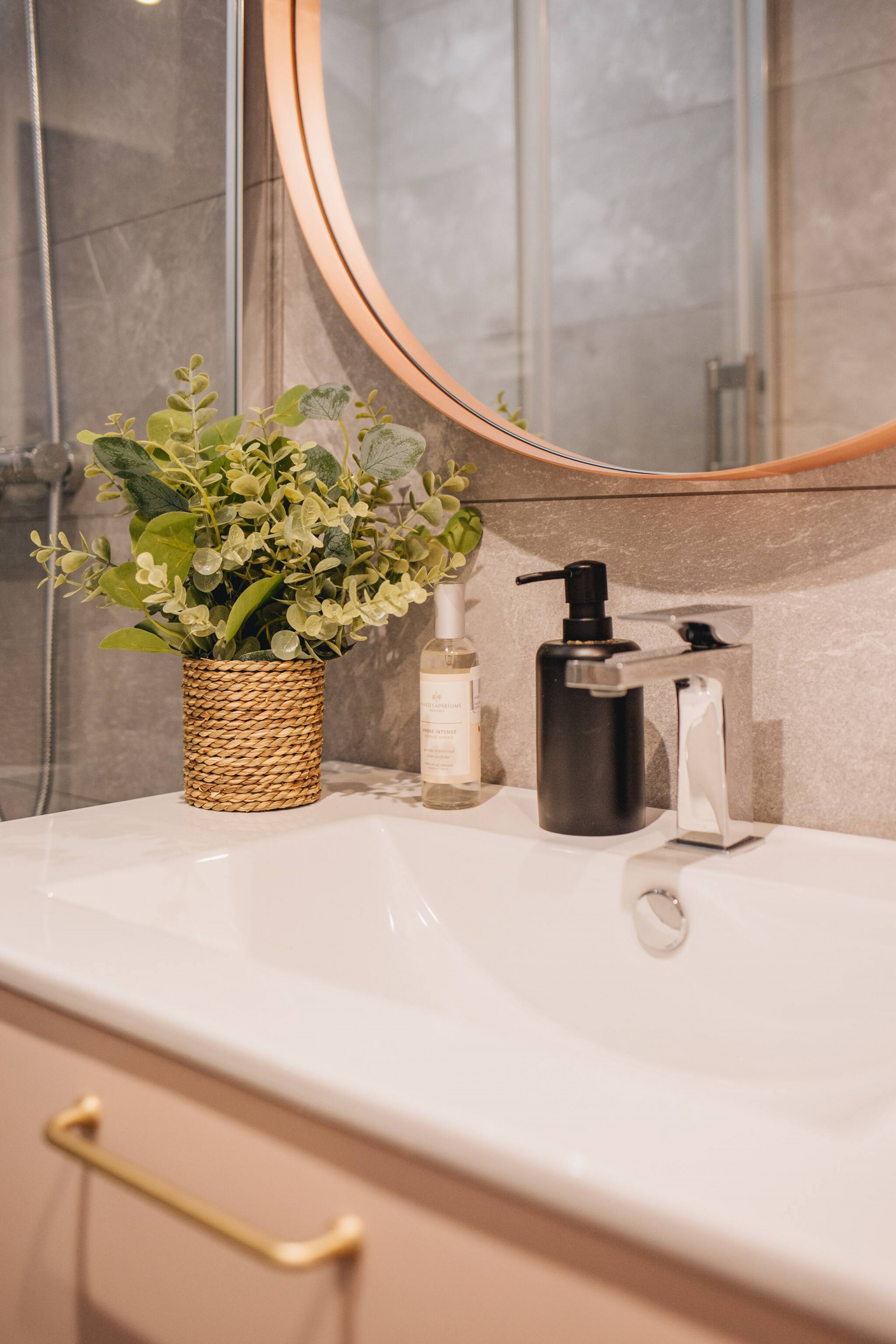 🚿 La salle de bain moderne offre une douche à l’italienne et un meuble vasque fonctionnel.