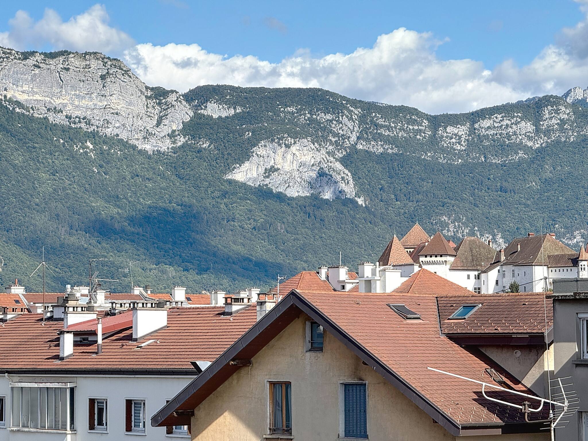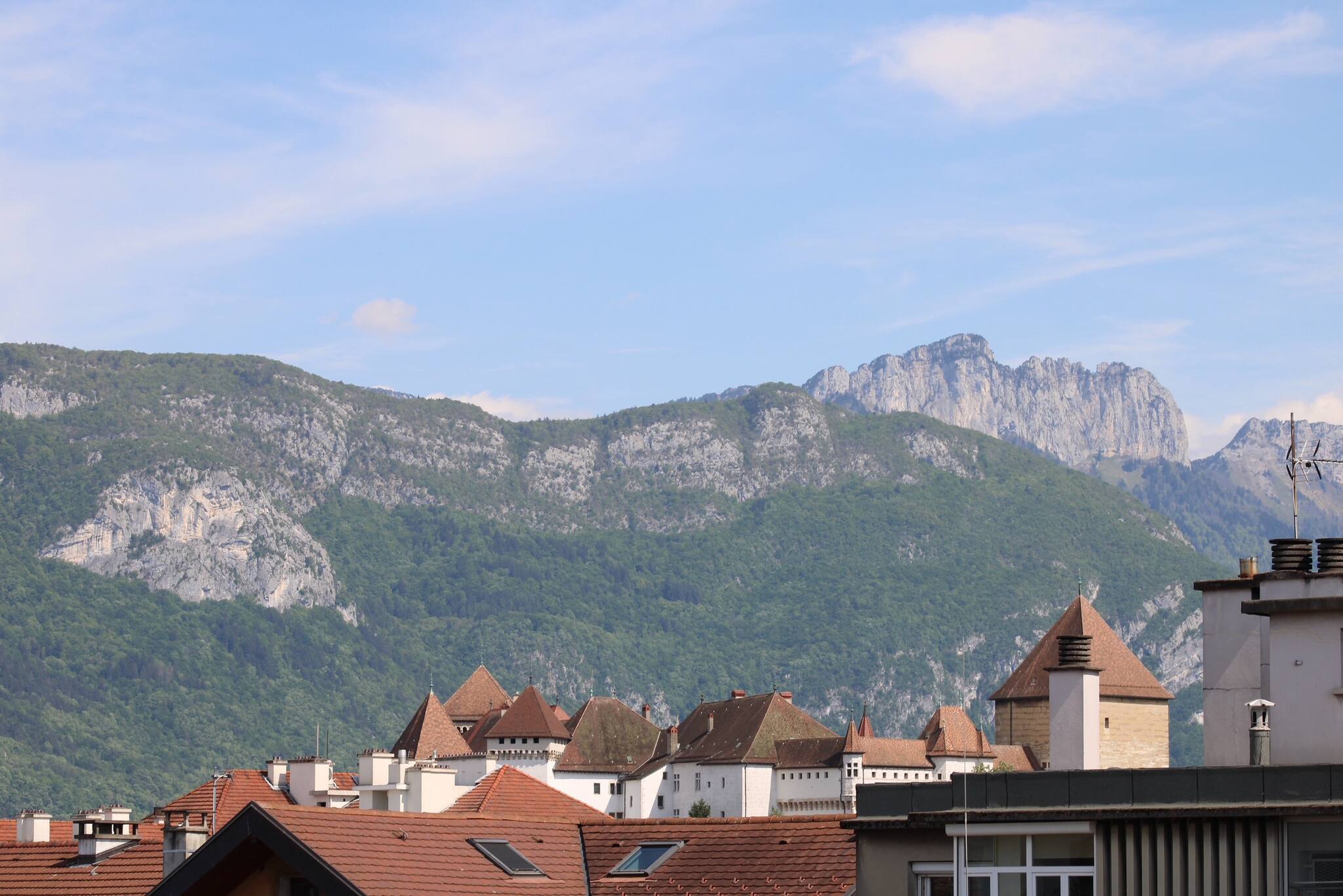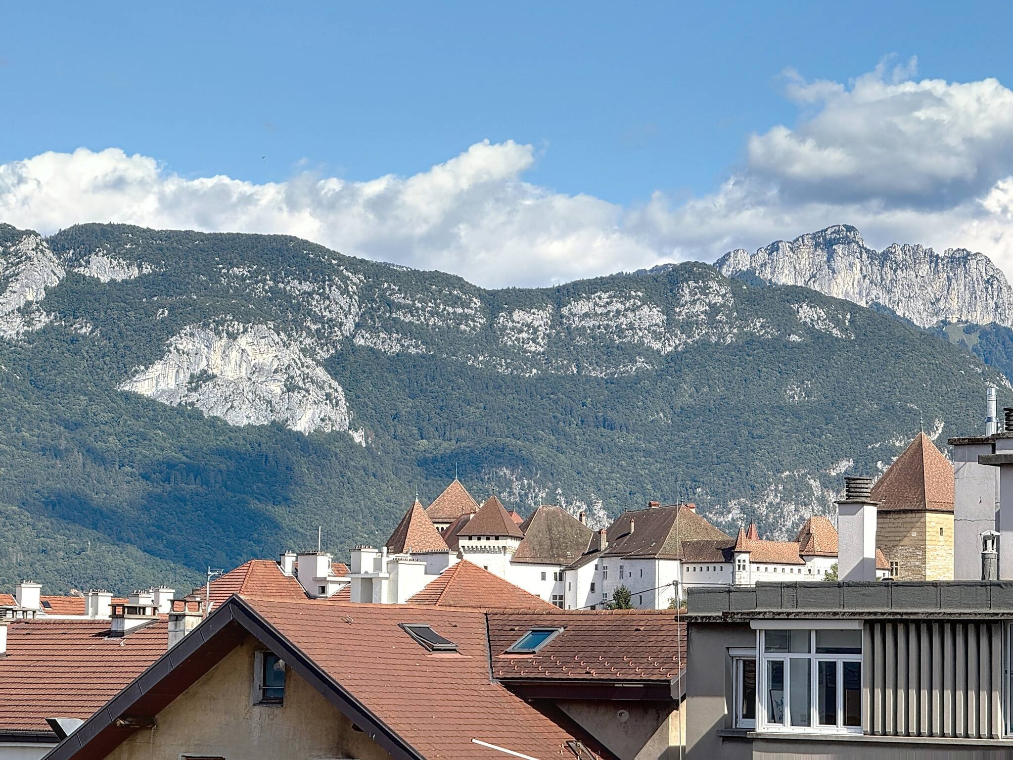 🏔️ Depuis le balcon, profitez d’une vue dégagée exceptionnelle sur les toits de la ville, avec en ligne d’horizon le château 🏰, le mont Veyrier et la majestueuse Tournette 🏔️.