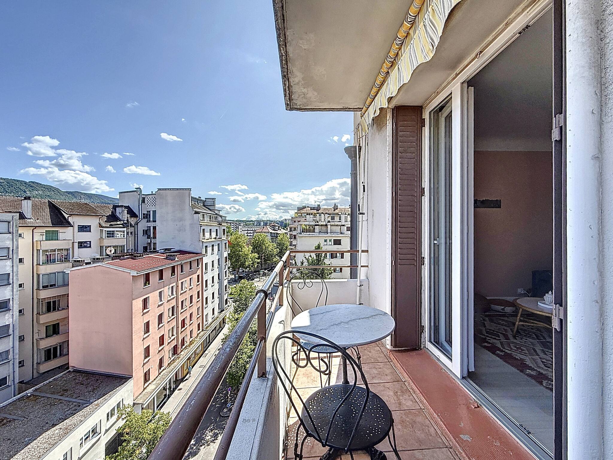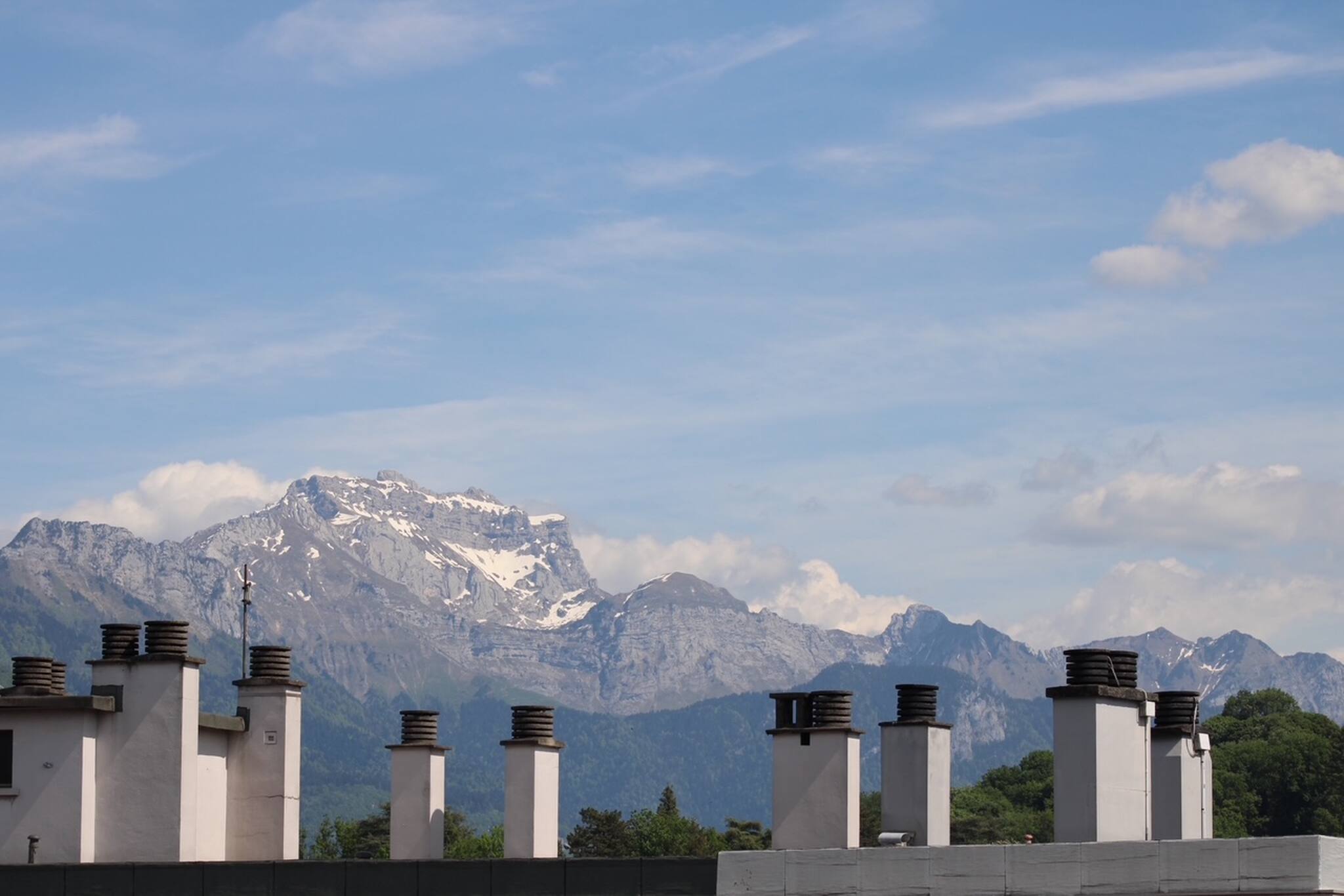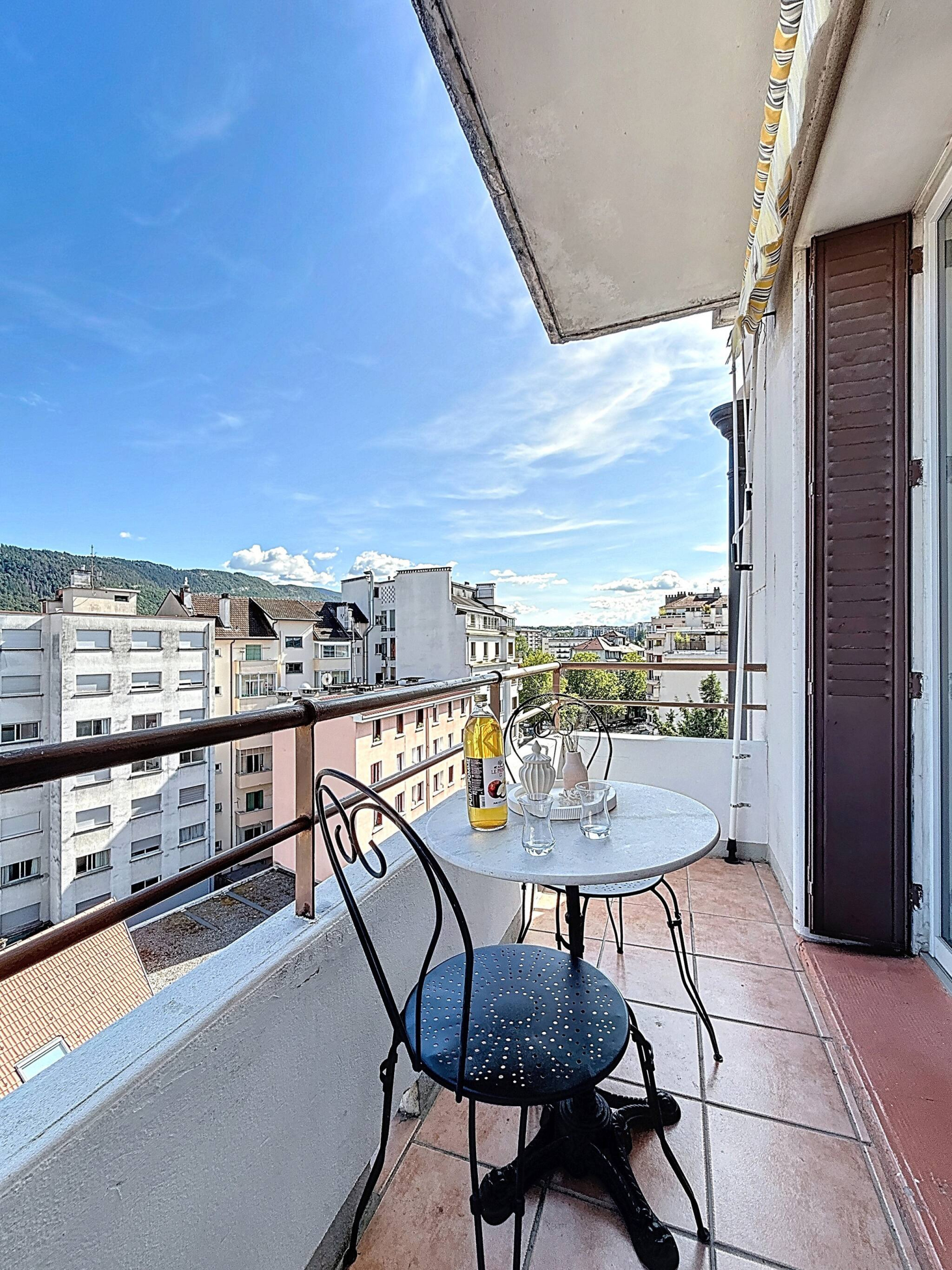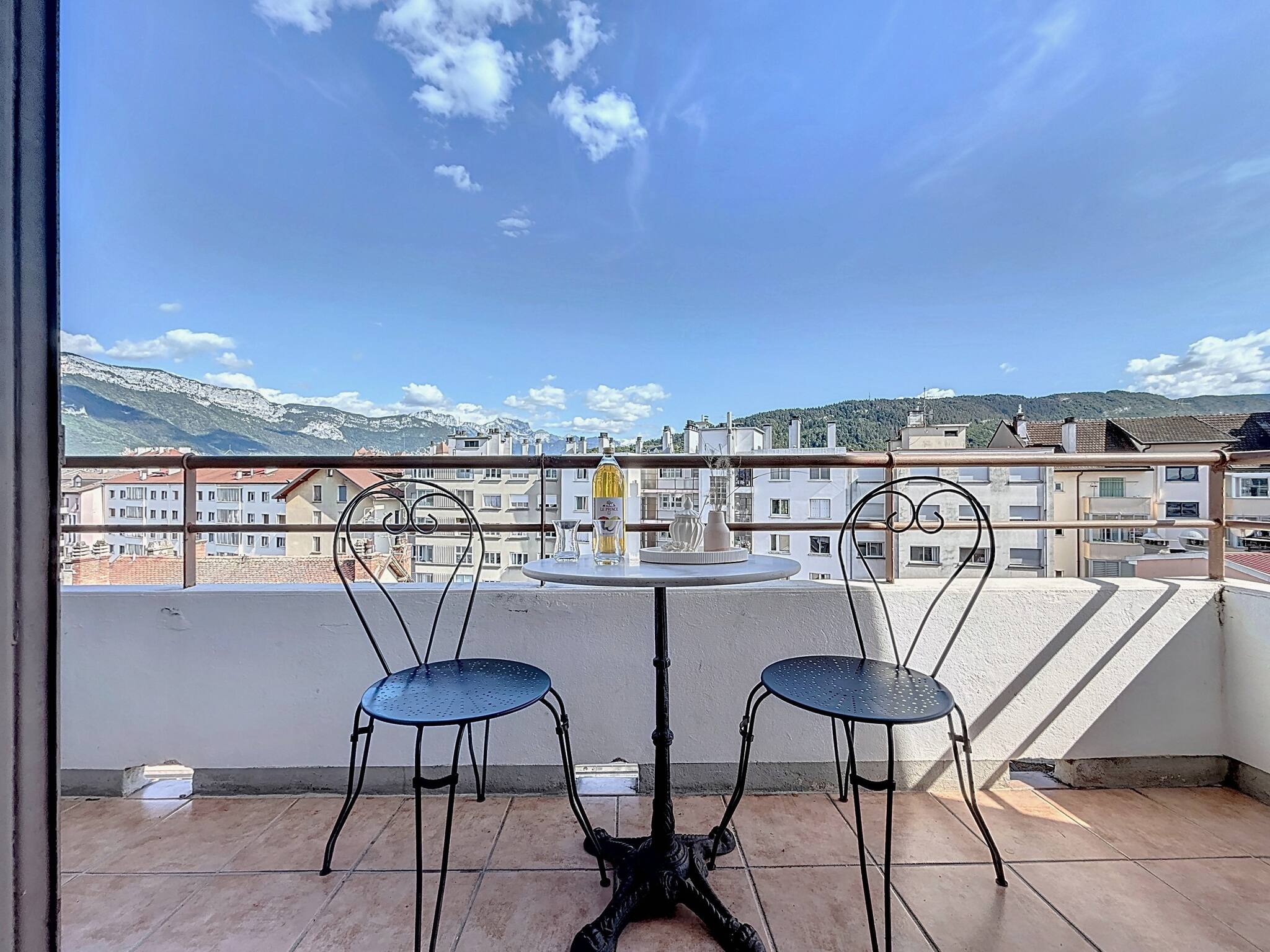 🏔️ Depuis le balcon, profitez d’une vue dégagée exceptionnelle sur les toits de la ville, avec en ligne d’horizon le château 🏰, le mont Veyrier et la majestueuse Tournette 🏔️.