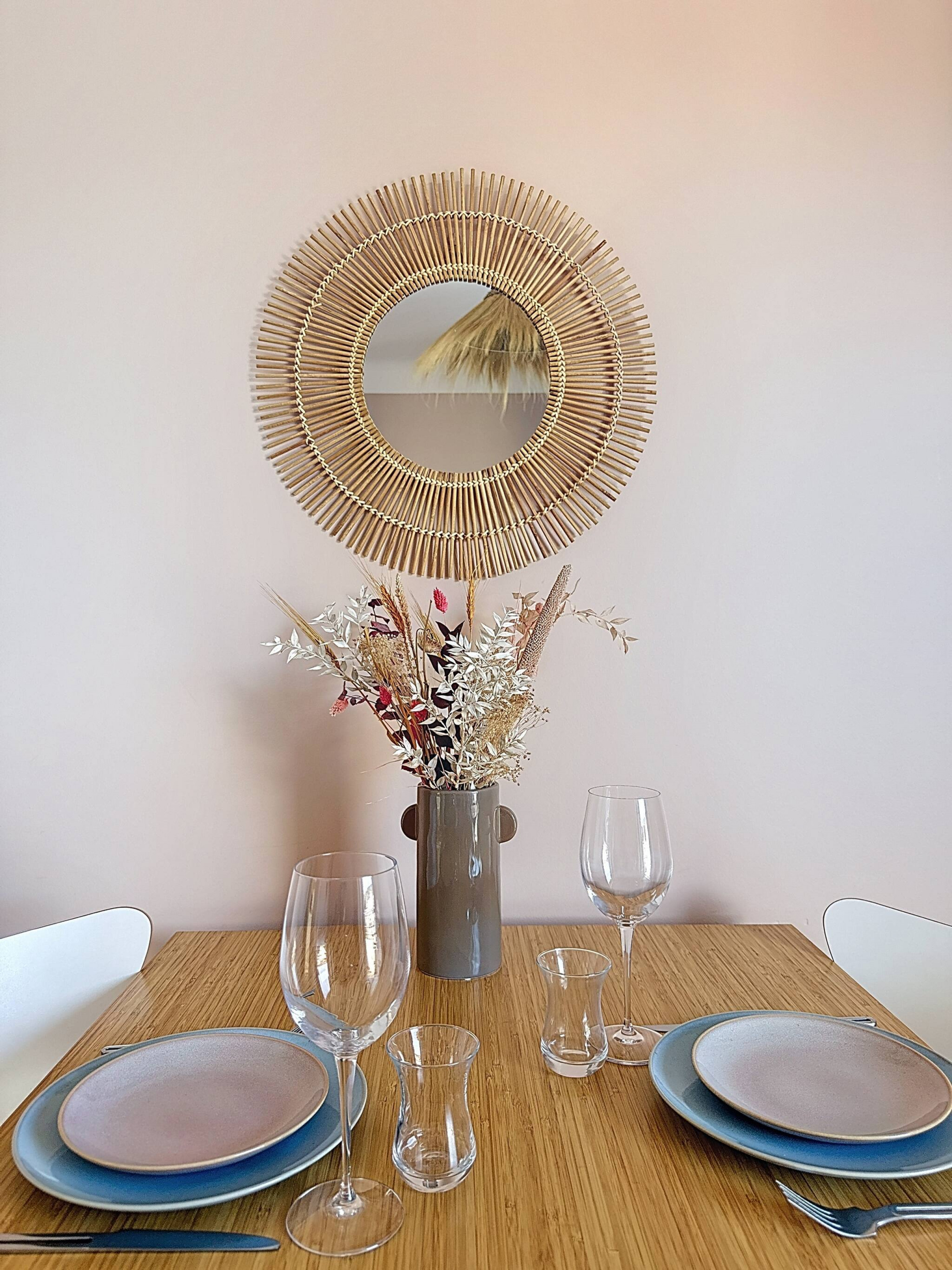 Ce charmant deux-pièces allie 🌿 élégance naturelle et 🪞 confort moderne : mobilier en bois clair, touches d’osier, feuillage de pampa et une atmosphère douce aux tons vert d’eau 💚