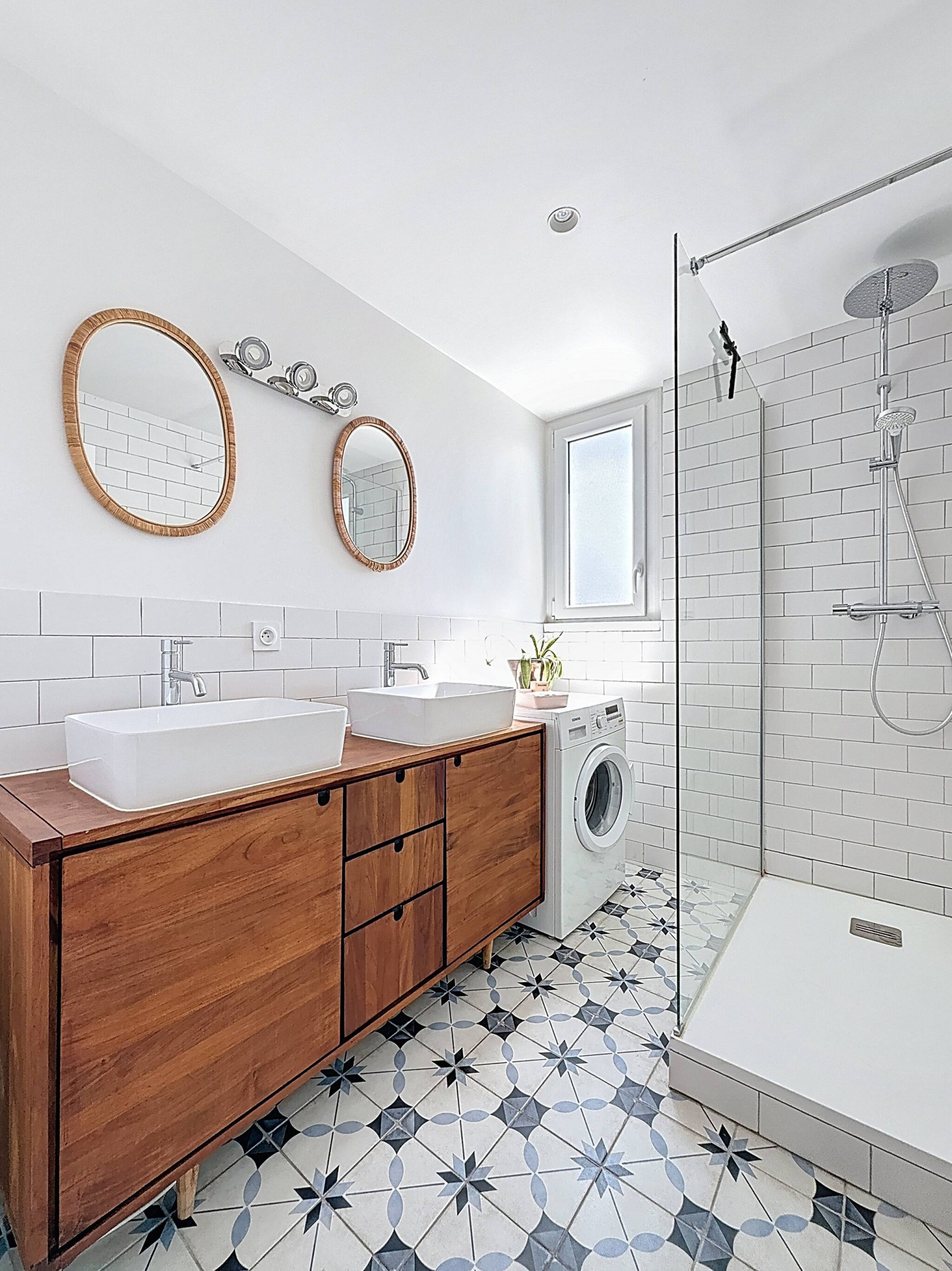 🚿 La salle de bain moderne offre une douche à l’italienne et un meuble vasque fonctionnel.