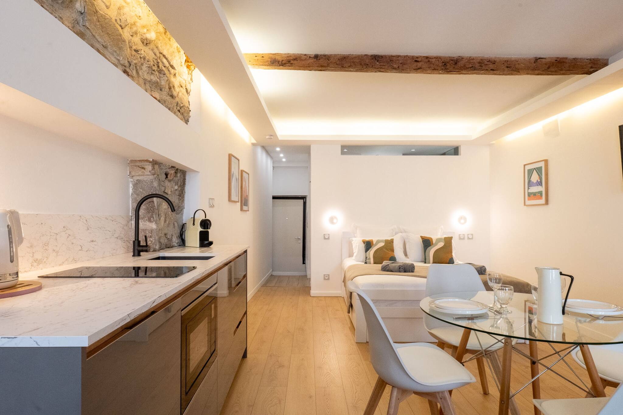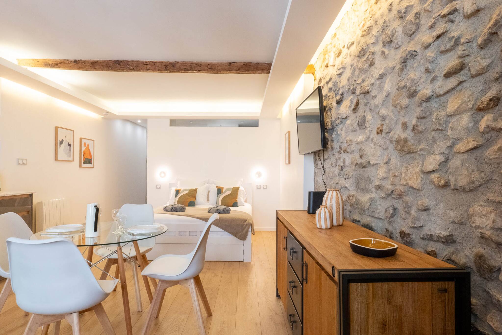 🛏️ Le studio dispose d’un lit double haut de gamme pour un sommeil réparateur, d’une kitchenette entièrement équipée (plaque, frigo, vaisselle…) et d’une salle de bain neuve avec baignoire.