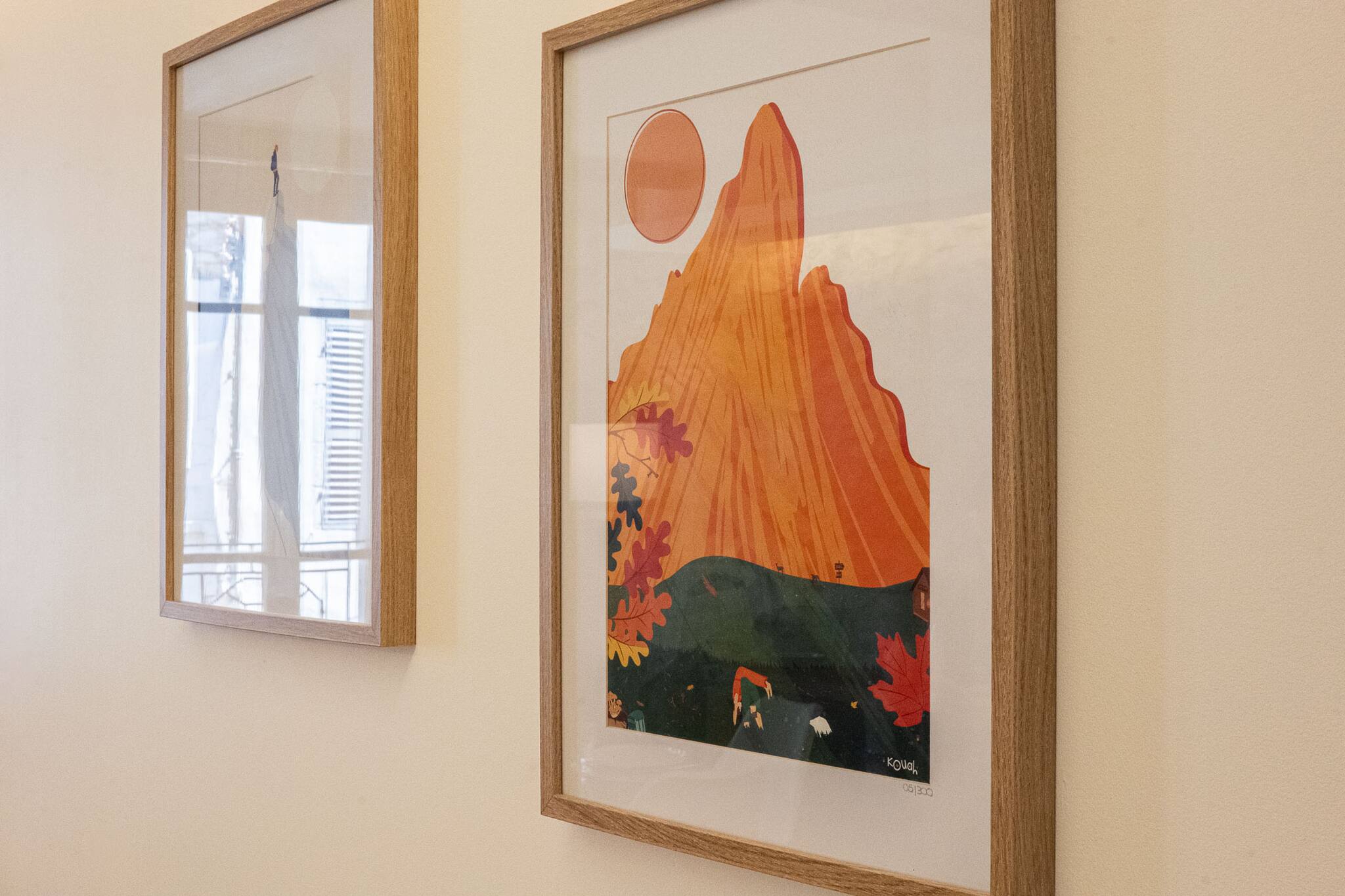 🎨 La décoration épurée, gris et blanc, est rehaussée par des œuvres inspirées du célèbre peintre Matisse, pour une ambiance à la fois contemporaine et artistique.
