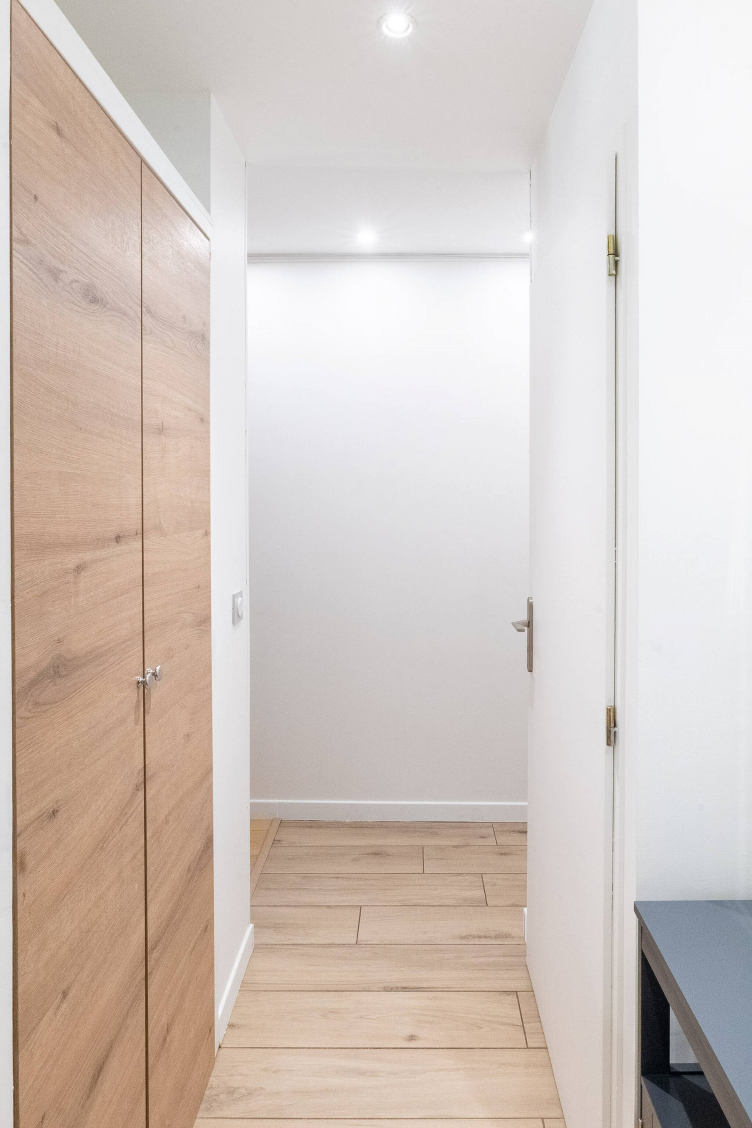 Niché au 9ᵉ étage d’un immeuble historique, l’appartement a été entièrement rénové pour offrir un cadre élégant et apaisant.