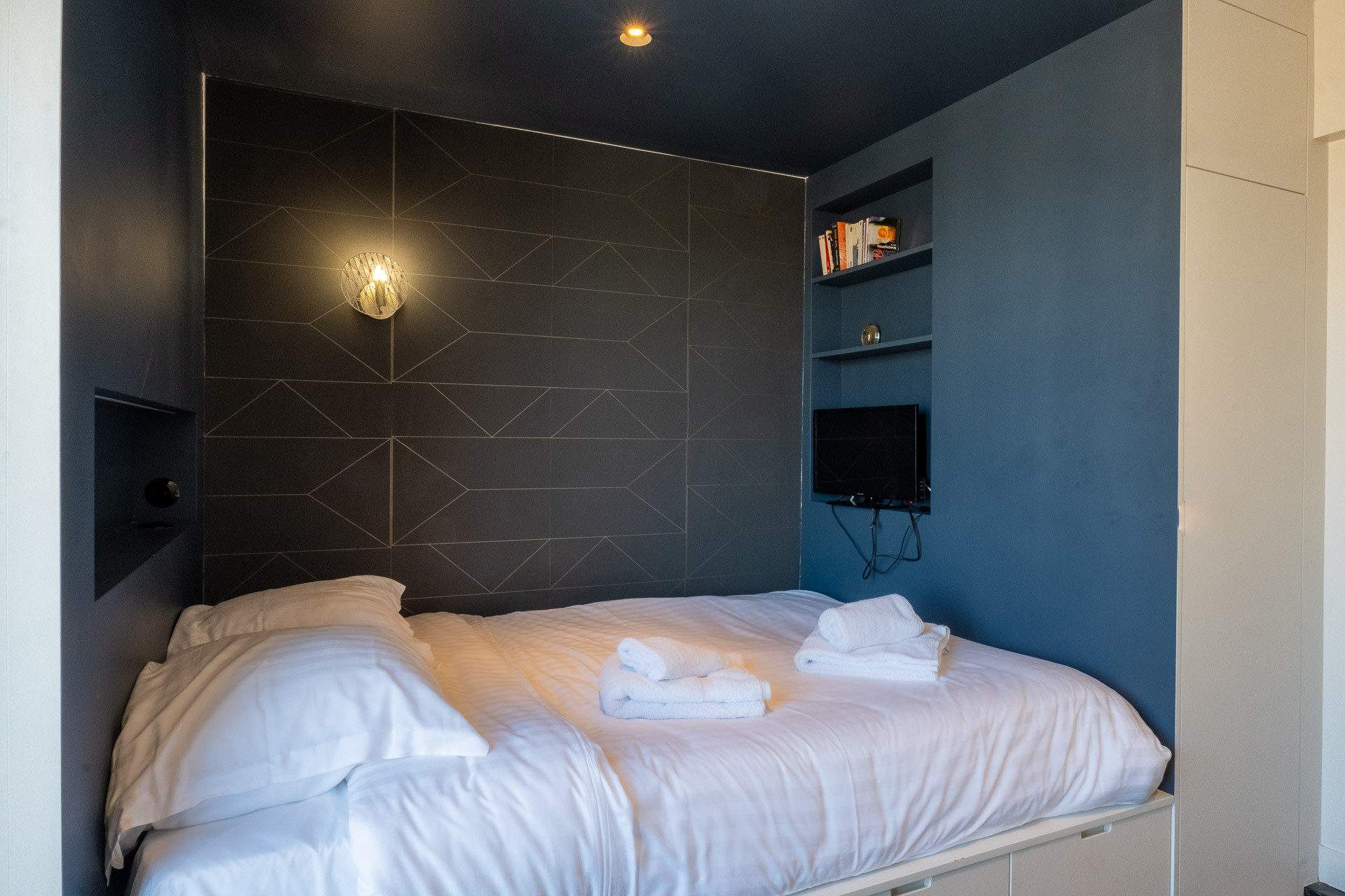 Côté nuit, un lit douillet de 160 cm 🛏️ vous attend pour des nuits paisibles et réparatrices, dans une atmosphère calme et intime.