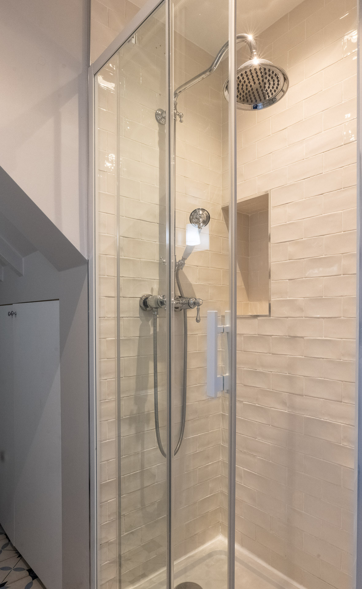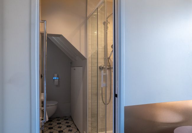Niché au 9ᵉ étage d’un immeuble historique, l’appartement a été entièrement rénové pour offrir un cadre élégant et apaisant.