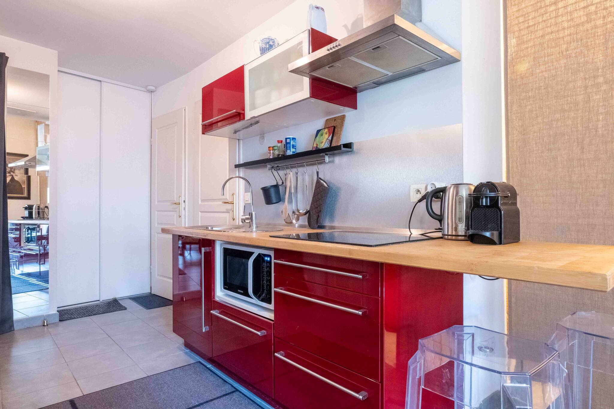 🍽️ Cuisine ouverte sur le salon : Équipée d’un réfrigérateur avec congélateur, d’un four micro-ondes, de plaques de cuisson, d’un grille-pain, d’une cafetière Nespresso, d’une bouilloire, ainsi que d’un espace repas avec deux tabourets pour vos moments gourmands.